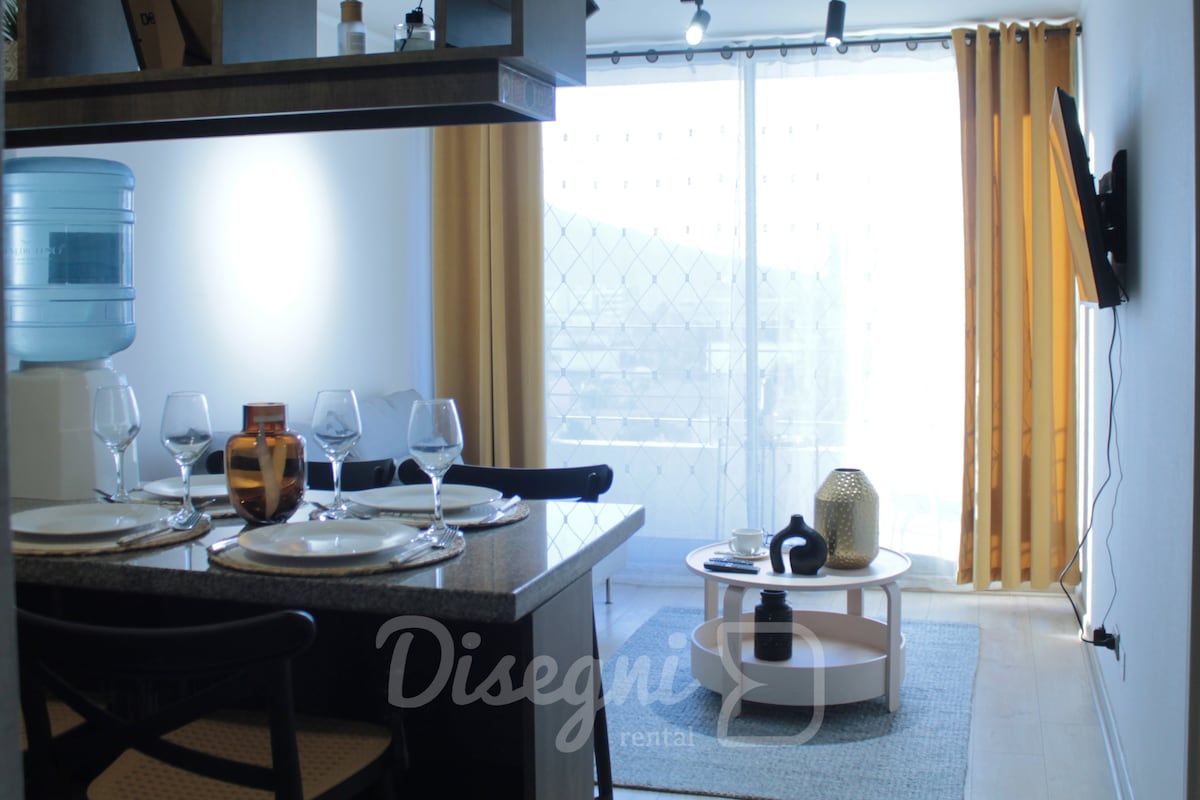 Departamento completo y cómodo ubicado en sector céntrico de Copiapó, a solo 5 minutos caminando del centro, ideal para viajes de trabajo, estadías largas o descanso. Cuenta con 2 dormitorios (cama matrimonial y litera), 1 baño, living comedor luminoso y vista a la ciudad. Totalmente equipado con cocina completa, WiFi rápido, TV cable, lavadora y secadora, además de estacionamiento subterráneo incluido. Excelente conectividad y servicios cercanos, con el respaldo de Disegni Rental.