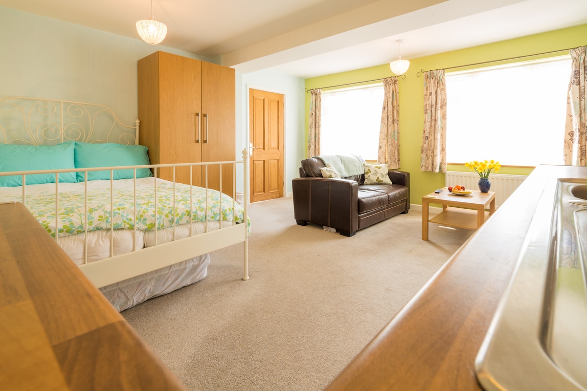 This ground floor studio apartment is based in a converted garage/barn. This is situated in the grounds of a three acre smallholding, overlooking the field with ponies grazing, this accommodation will give you a peaceful break in the countryside, whether you are taking a break, seeking accommodation for visiting relatives or on business. The apartment has its own discreet entrance but can be used together with the first floor apartment for a family of four as there is an inter-connecting door.