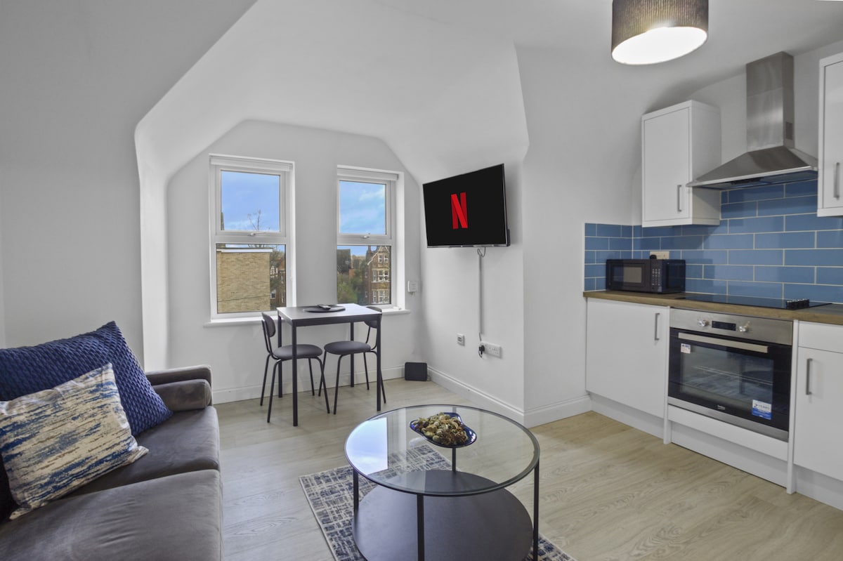 A lovely self catering studio flat & en-suite in Bedford Free off-road parking right outside the door! Double bed (+1 single if required). Sofa, TV & fast WiFi Kitchenette contains double induction hob, microwave, & 'fridge. Welcome pack of fresh fruit & groceries. Table for dining or home working Your laundry done for a small charge Fan provided In a safe area. Quick and easy access to the A421, A6, A1 & M1. 35 mins train to London. NO SMOKING / NO PETS
