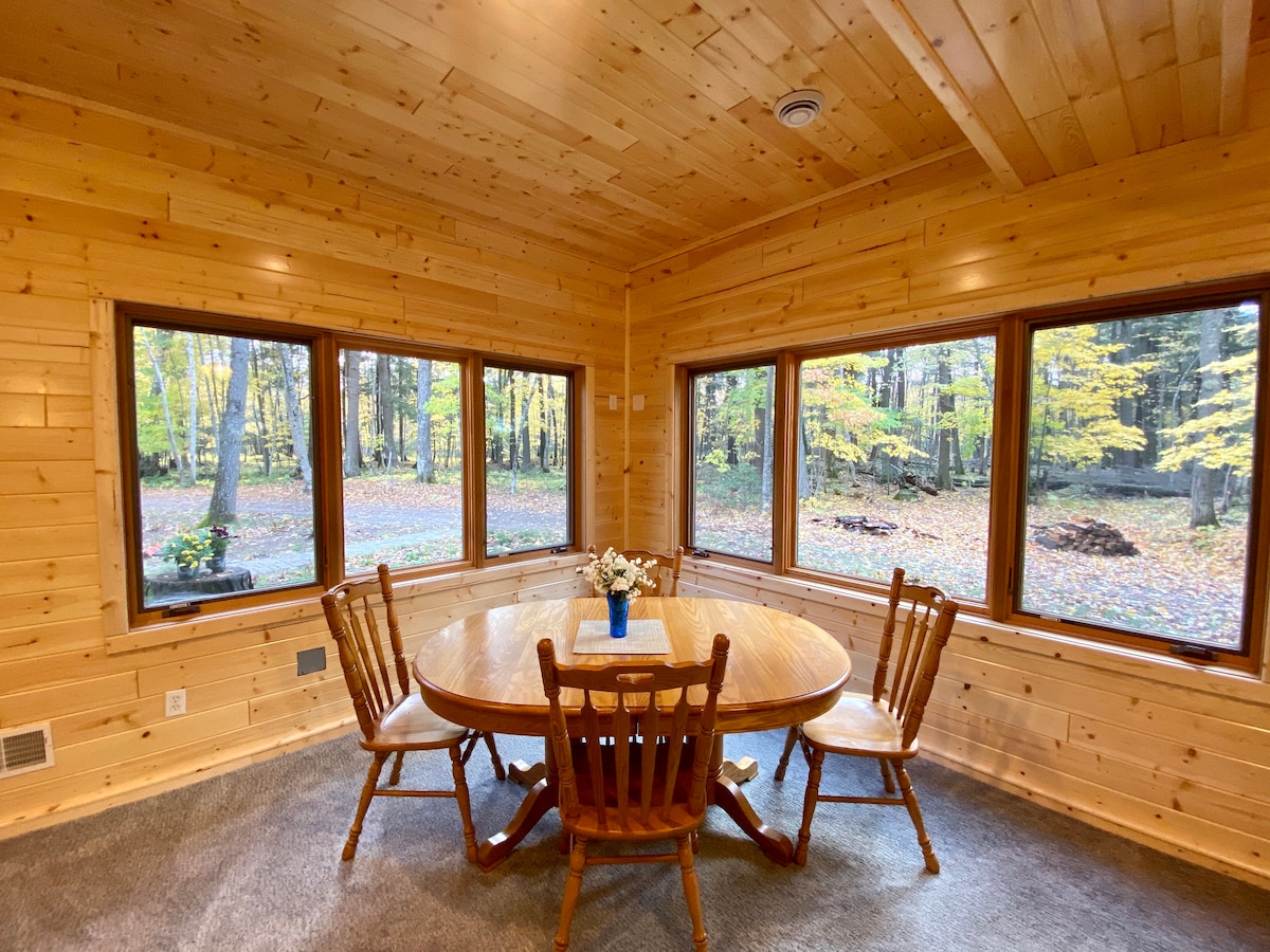 Built as a winter or summer escape for a couple or small group, this beautiful four season cabin is a great way to experience the Northwoods of Wisconsin in a modern, well-appointed, aesthetically rich space designed with relaxation in mind This cabin was built in 2021 and host is 13 year "superhost" This is a default "no pets" cabin, however exceptions can be made with permission and a fee. Inquire with host. NEMA 15-40R outlet provided for level 2 EV charging. You bring chord and adapter.