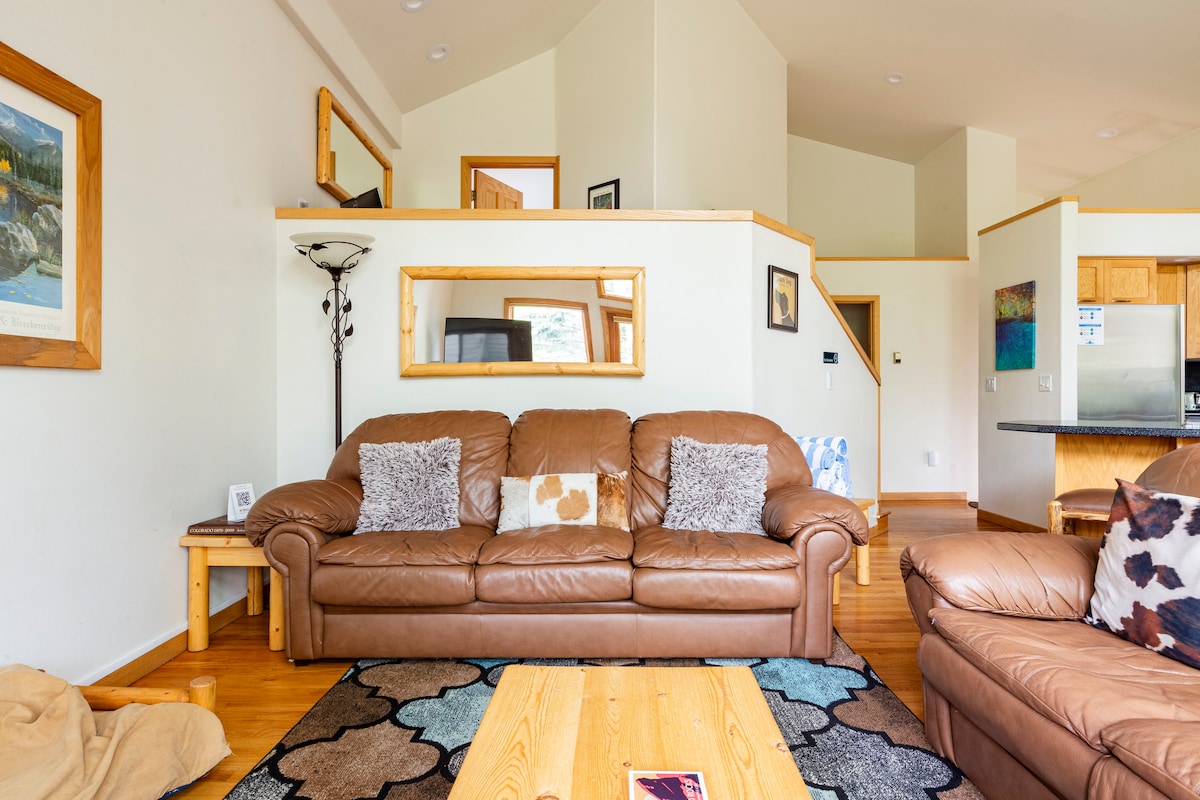 Updated slope-side condo in Center Village with views of the American Eagle lift. True ski-in/ski-out with on-site parking, elevator access, and a slope-side ski locker. Sleeps 6 with 6 beds: loft king, Cal king window bed, convertible leather daybed (two twin XLs), plus two twin floor mattresses. Sunny south-facing dining nook, vaulted ceilings, and a cozy gas fireplace. Please note: loft is open and accessed via a spiral staircase.