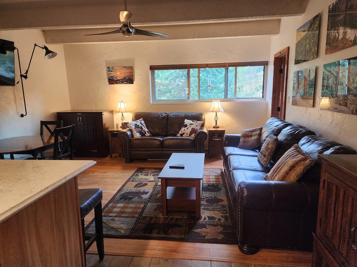 Peak View Place rental studio sleeps 4, has beautiful mountain views, an onsite seasonal hot tub and is within walking distance to both Main Street and the Summit Stage shuttle that links Frisco to Breckenridge Ski Resort (11 miles), or Copper Mountain (7 miles). In the winter there's skiing and tubing at Frisco Adventure Park just 1.5 miles away, while for summertime take your SUP or kayak to Frisco Bay is just 1 mile away. Endless hiking trails and the bike path are just outside the door.