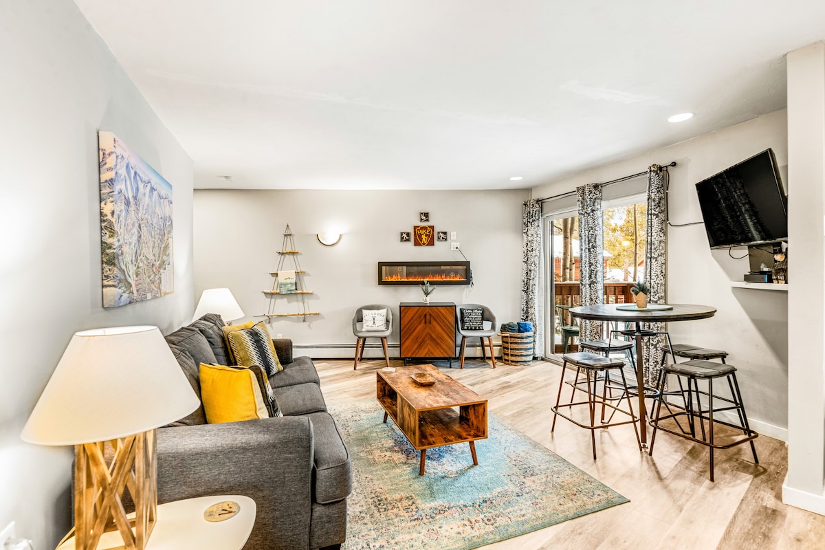 Excellent Mountain Location - Renovated 2 bedroom (Bedroom / Den) with 2 Full Bathrooms. Full kitchen, fireplace, ski locker and sleeps up to 6 people. Right on the base of the high speed Super B Lift. Ski Lodge next door & great for family ski trips. Eagle, Flyer ski-lifts and Gondola nearby. Smart TV, Wi-Fi, Free Parking, Beautiful in the summer months. On the golf course, river, bike path. Access to the Athletic Club with Hot Tubs, Indoor Pool, Steam Rooms, Saunas and more for guest day fee.