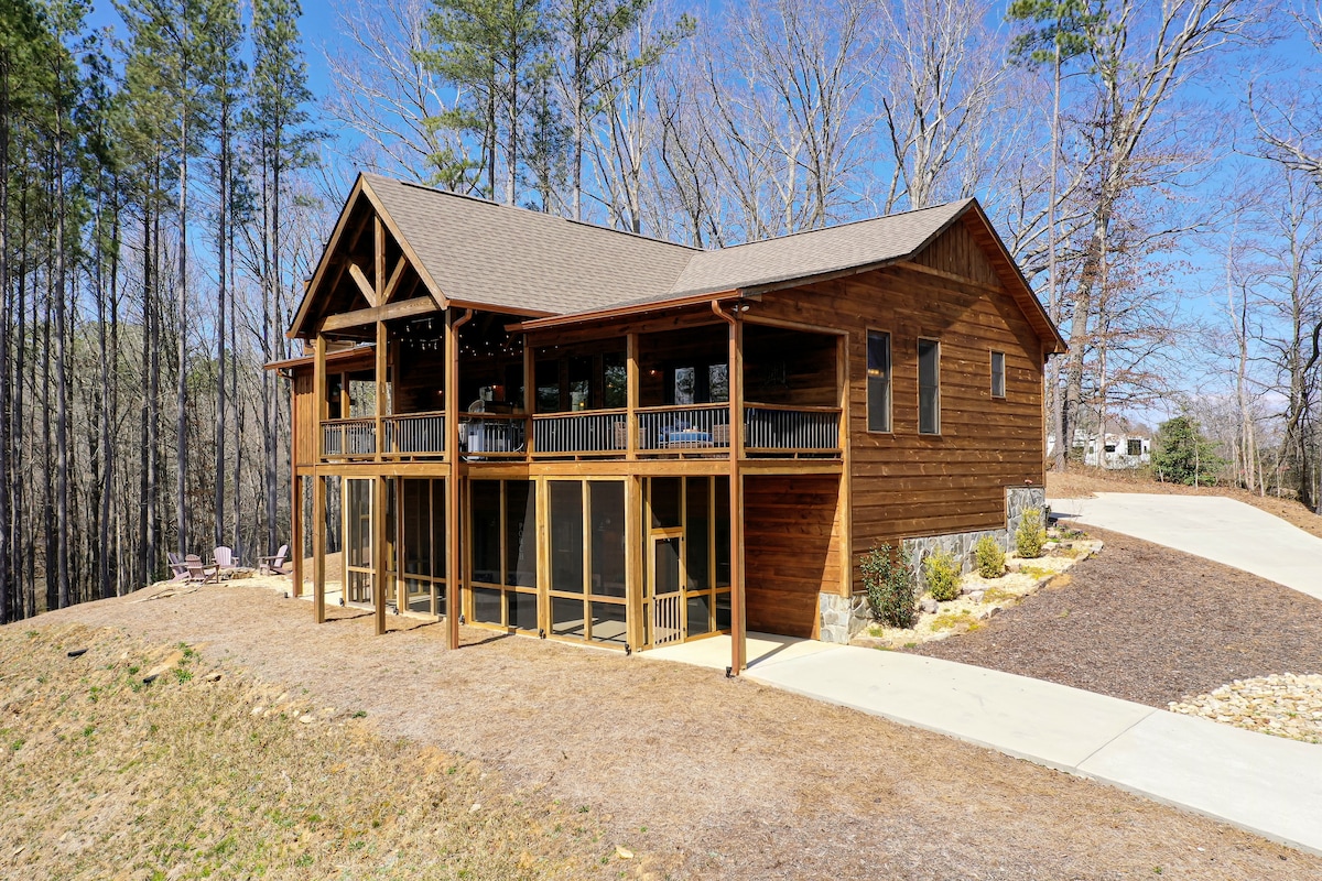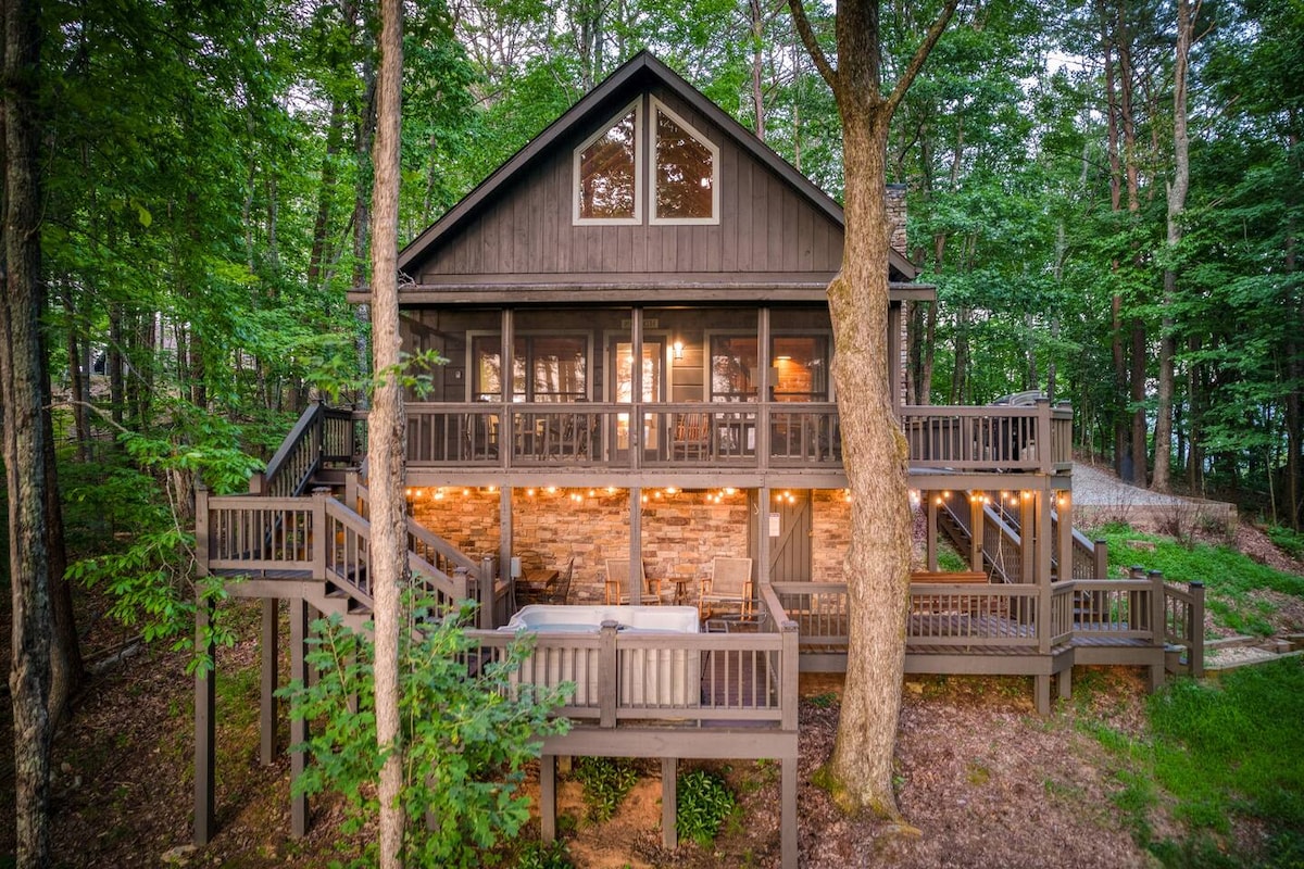 Escape to the serene charm of Lantern Landing, a brand-new cabin perched above Lake Blue Ridge. This 3-bedroom retreat blends luxury and comfort with en-suite bathrooms, sweeping lake views from a private deck, and inviting common areas. Unwind by the outdoor fire pit, soak in the hot tub, or explore the lake with complimentary kayaks. The patio features a large flat-screen TV and a game table with ping-pong and air hockey. Lantern Landing offers an unforgettable getaway for family and friends.