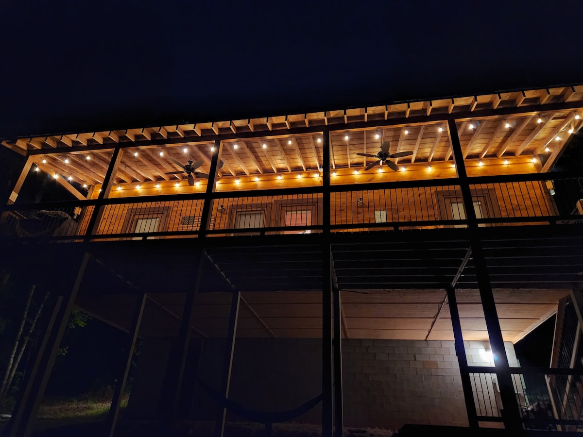 The Bluff Haus is a chalet-style getaway in the Blue Ridge Mountains. Two decks overlook a lush forest – and are the stuff of Appalachian dreams. From an outdoor living room to a hot tub and glowing string lights, our decks are a vacation destination unto themselves. Inside, this new house inspires and comforts you across two floors with a farmhouse vibe, tons of amenities, free EV charging, and large windows with endless tree views.