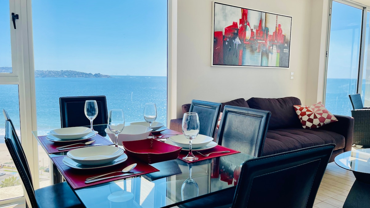Hermoso departamento frontal primera línea, de la terraza una vista a toda la Avenida del Mar y la playa. Piso 7, Estacionamiento, 2d 2b y 1 futón. Piso flotante nuevo, cocina americana, TV, Wi Fi, Juegos de Mesa para jugar en familia y una linda hamaca en terraza. Equipamiento Edificio: Gimnasio, cancha de tenis, sala de pool, piscina, sauna, quincho, conserje 24/7, juegos para niño, áreas verdes, sala de eventos. Las camas cuentan con sábanas y cobertor. se dejan 2 toallas