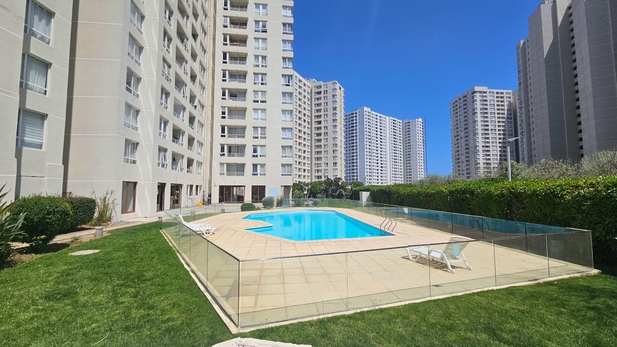 Departamento a pasos de la playa, con espectacular vista de la avenida del mar, VISTA LIBRE ,es un sistema de paneles que cierran la terraza y lo trasforma en un ambiente adicional y seguro. Cercano a diferentes restaurantes y casino enjoy. Un lugar perfecto y totalmente tranquilo para disfrutar con la familia en vacaciones, acogedor y cálido. Totalmente equipado con todo lo necesario, cuenta con Wifi, tv cable, sabanas y toallas, piscina, cocina con todos los implementos, calefacción.