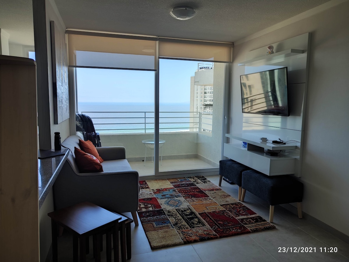 Espectacular departamento en primera linea con vista directa a la playa y toda la bahía. Ubicado en condominio Brisamar. Cercano a casino Enjoy, supermercados, restaurantes de primer nivel y típicas picadas. El departamento está totalmente equipado, para que solo te relajes escuchando el mar durante tus vacaciones. Se encuentra en el piso 20, tiene instalada malla de seguridad en el balcón y en ventanas para mayor seguridad. Estacionamiento techado, gimnasio, sala de estar, seguridad 24 hrs.