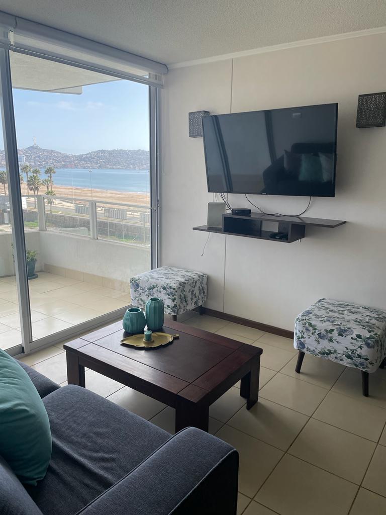 Espectacular departamento en primera linea con vista directa a la playa y toda la bahía. Ubicado en condominio Brisamar. Cercano a casino Enjoy, supermercados, restaurantes de primer nivel y típicas picadas. El departamento está totalmente equipado, para que solo te relajes escuchando el mar durante tus vacaciones. Se encuentra en el piso 20, tiene instalada malla de seguridad en el balcón y en ventanas para mayor seguridad. Estacionamiento techado, gimnasio, sala de estar, seguridad 24 hrs.