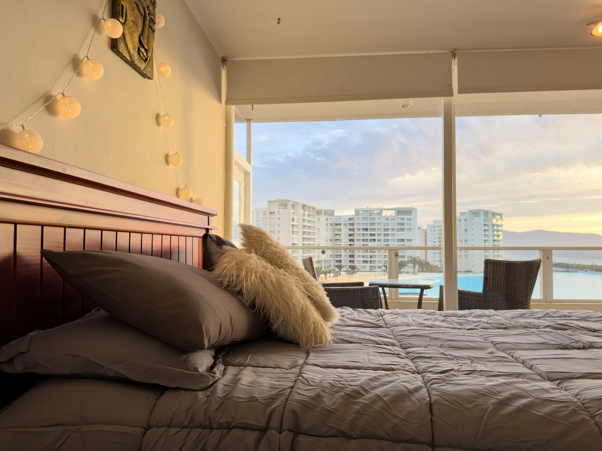 Despierta cada día con la brisa del mar y una vista privilegiada del océano en este acogedor departamento ubicado en primera línea de la Avenida del Mar. Para descansar o trabajar con la mejor vista y ubicación de La Serena. Precioso y acogedor departamento, a pasos de Casino Enjoy y cercano a los mejores restaurant de la ciudad. Totalmente equipado para 4 personas, con estacionamiento privado y todo lo necesario para relajarte y disfrutar. Vive el mejor descanso con las mejores comodidades.