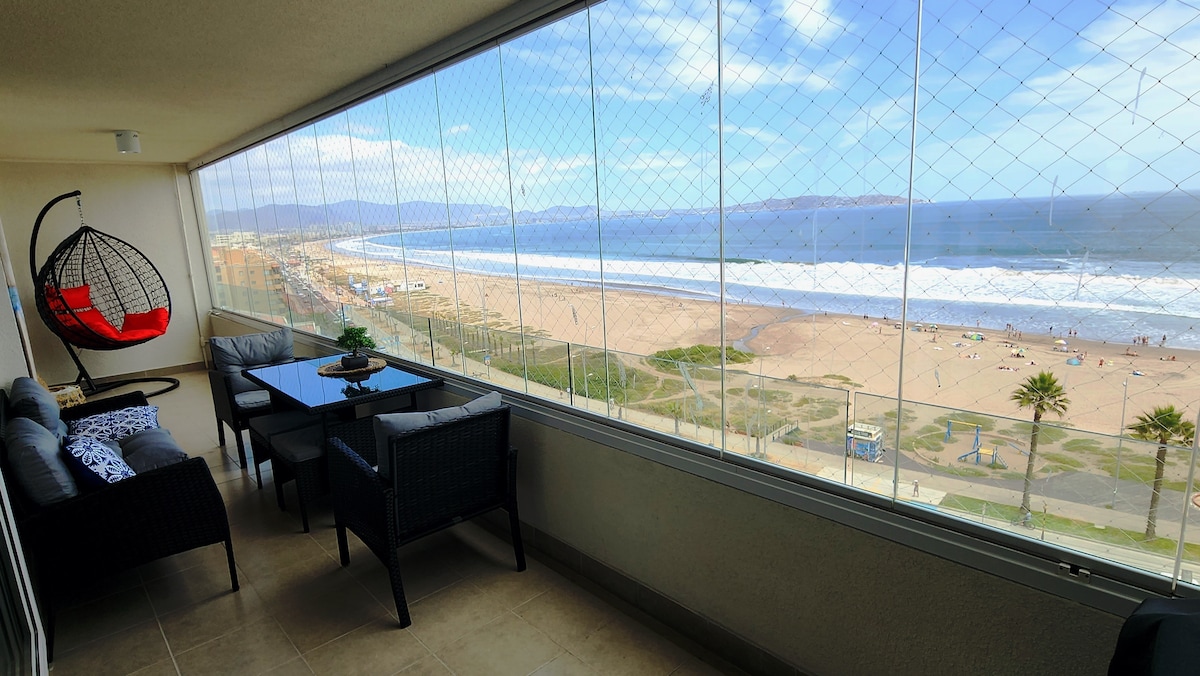 Apartamento frente a la playa en La Herradura. Despierta con el sonido del mar y disfruta de un amanecer increíble desde la terraza. El condominio cuenta con acceso directo a la arena e incluye estacionamiento privado gratuito, TV, Wi-Fi de alta velocidad y cocina completamente equipada. Podrás disfrutar de amplios espacios comunes perfectos para toda la familia: quincho, saunas, piscinas, jacuzzi y áreas de juegos infantiles. “Te esperamos para que vivas una experiencia única junto al mar”