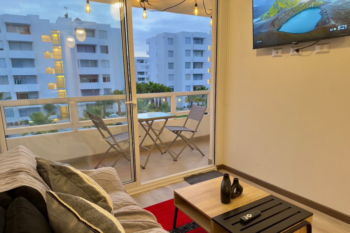 Apartamento frente a la playa en La Herradura. Despierta con el sonido del mar y disfruta de un amanecer increíble desde la terraza. El condominio cuenta con acceso directo a la arena e incluye estacionamiento privado gratuito, TV, Wi-Fi de alta velocidad y cocina completamente equipada. Podrás disfrutar de amplios espacios comunes perfectos para toda la familia: quincho, saunas, piscinas, jacuzzi y áreas de juegos infantiles. “Te esperamos para que vivas una experiencia única junto al mar”