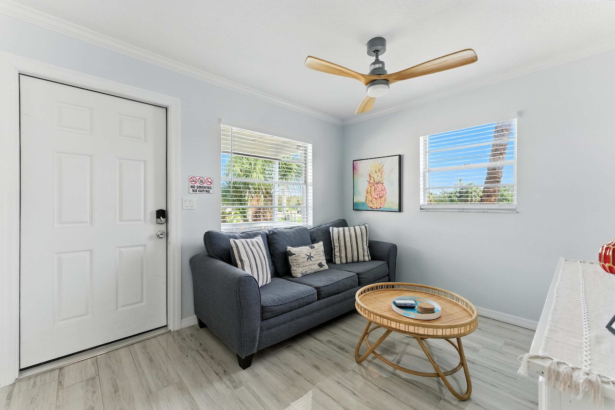 Unit 2 Ground floor;800 sq ft; patio; limited beach view . Steps to the white sandy beach across the street Free parking to registered guest. Fully equipped kitchen with markets nearby, Restaurants and shopping, within walking or hop free trolly. Trolly stop nearby. Linens and basic supplies are included. Overnight guest are welcome to arrive early to adventure the island, stay parked until after sunset on departure day.