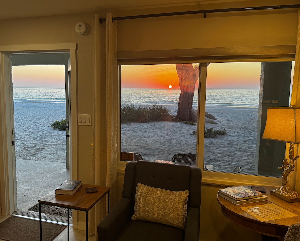 Welcome back to paradise ! STEPS to your private beach without the tricks or gimmicks found elsewhere on the Siesta Key. This is the only studio in the Palm Bay Club tower on ground level with breathtaking views of the white sand and gulf waters. The Palm Bay Club offers 2 pools, hot tub, gym, boat docks, fishing pier, outdoor grills, tennis/pickle ball courts; not to mention FREE parking+ beach lounge chairs. Enjoy 2 free bikes day rental with booking!