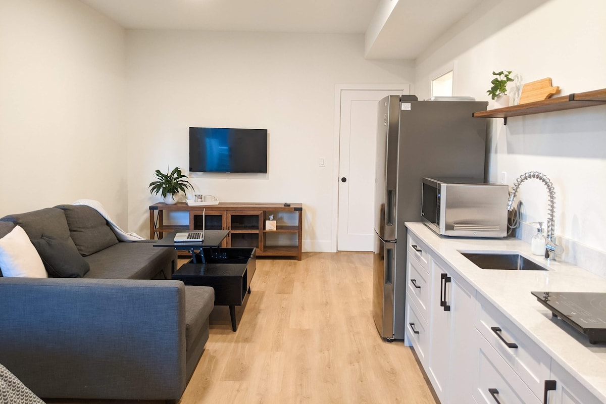 Guests love our top 5% home: sparkling clean, beautifully designed, and incredibly comfortable. Boutique-style suite with high ceilings, a luxurious king bed, and comfort better than a hotel stay. Enjoy a sunny living room, in-suite laundry, 1G Wi-Fi, 52" smart TV with Netflix, free coffee & tea, private entry, and free parking. Thermostat heating and naturally cool in summer. Walk to transit, parks, and trails; a short drive to shopping. Perfect for couples, families, solo, or business stays.