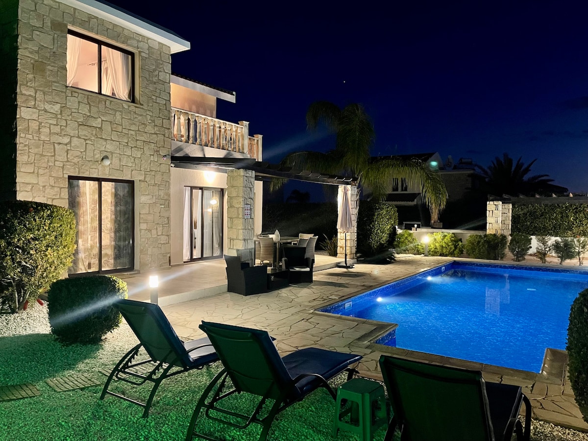 Reg. Number: AEMAK-PAF 0001032 Villa is near the beaches Coral Bay and Coralia in 2 minutes drive or 10 minutes walk, has private location, large swimming pool . Villa is equipped with all modern appliances and air conditioners. The restaurants, sport bars, supermarket are nearby. WiFi, Smart TV. Netflix available. !!! The electricity is over 25 kw per night is extra charged by meter. Swimming pool Is heated by request with a deposit approx. 10-20 euros per day depending on season.