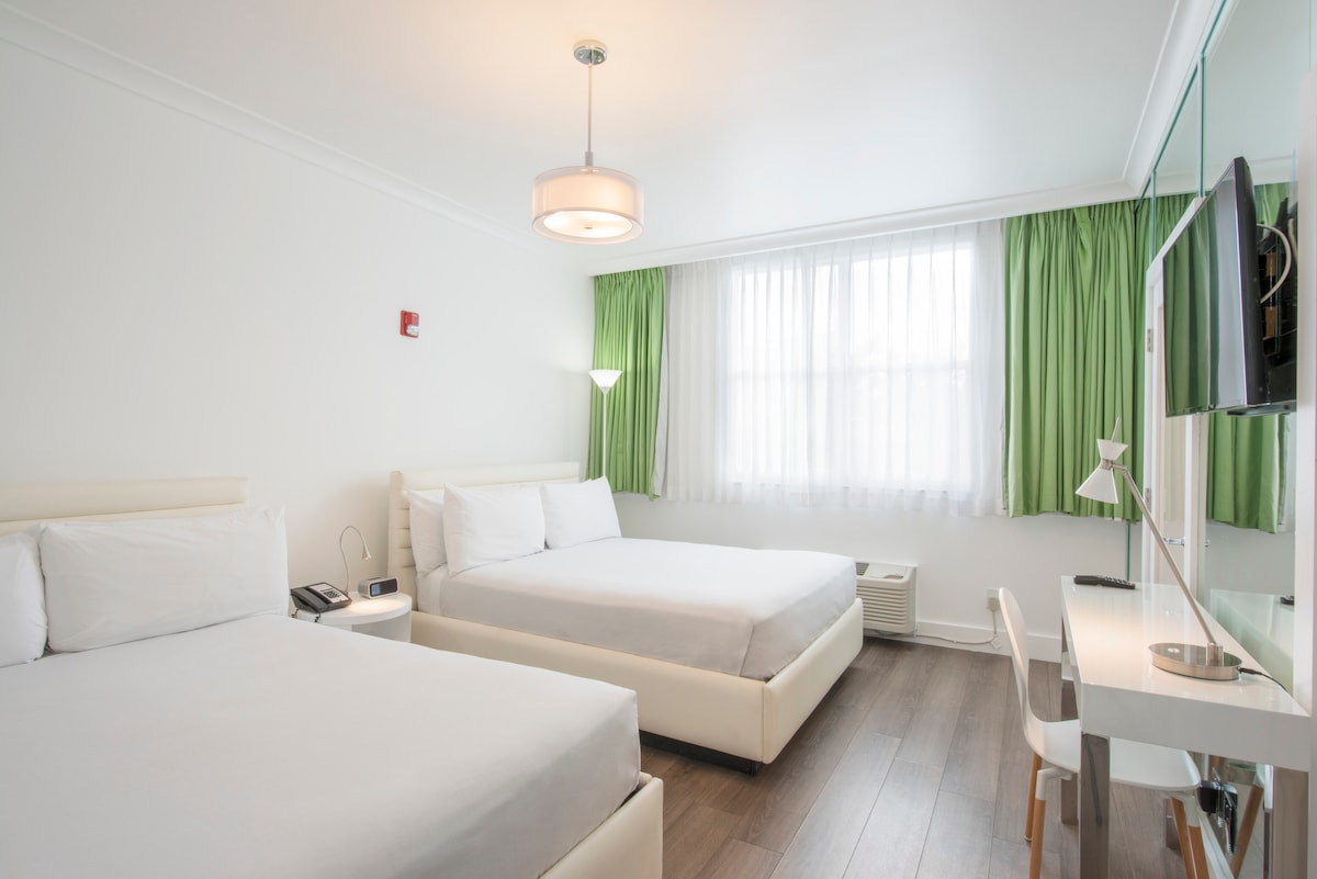 Located on Collins Ave in Miami Beach's Faena District. Understated and refined, our tranquil Double Room at Hotel Croydon features two inviting queen beds with upscale cooling gel memory foam mattresses, luxury C.O. Bigelow bath products, a mahogany porcelain tile floor, i Home docking station for your personalized melodies, a hairdryer, and a large flat-screen TV with cable.