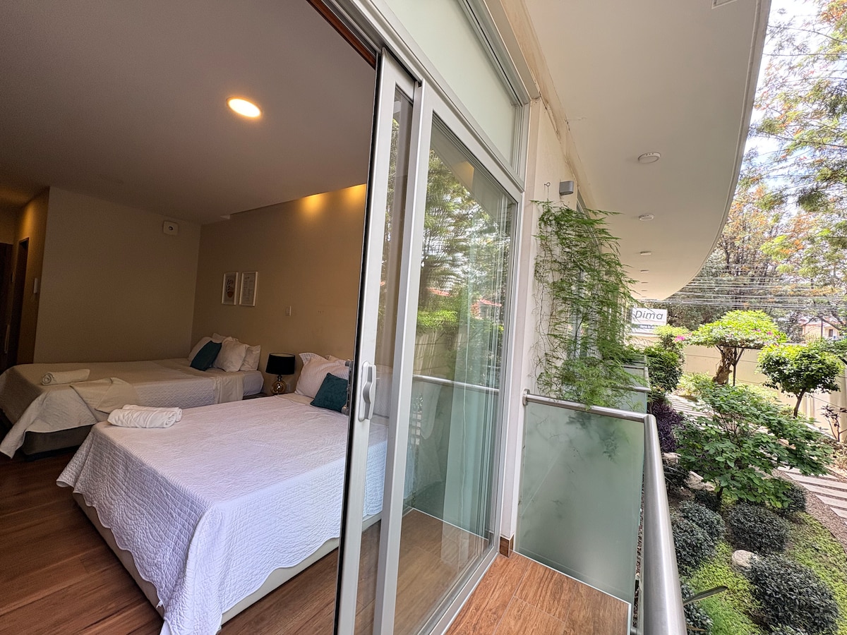 Hermoso monoambiente de lujo, con un hermoso balcón y vista a la ciudad, en la mejor zona de la ciudad, a pasos de Centros Comerciales, Supermercados, Restaurantes, Cines, Discotecas y Bares. Ideal para conocer la ciudad y sus principales atractivos o para viajes de trabajo. Tiene cocina, frigobar, tv, Wifi, microondas, un sofá cama, (opcionalmente, cuna, bañera y accesorios para bebe). y Adiciolmente el edificio cuenta con un cowork de lujo.