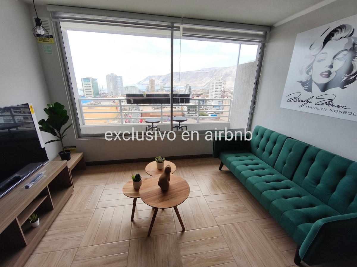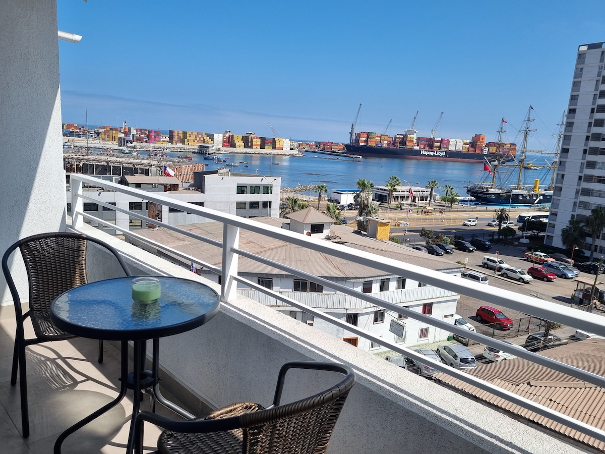 Hermoso y nuevo departamento de un dormitorio, completamente amoblado, tranquilo e ideal para dos personas , cómoda terraza con excelente vista al puerto de iquique, cuenta con wifi, tv por cable, central y cercano a pubs y restaurantes del centro histórico de la ciudad.