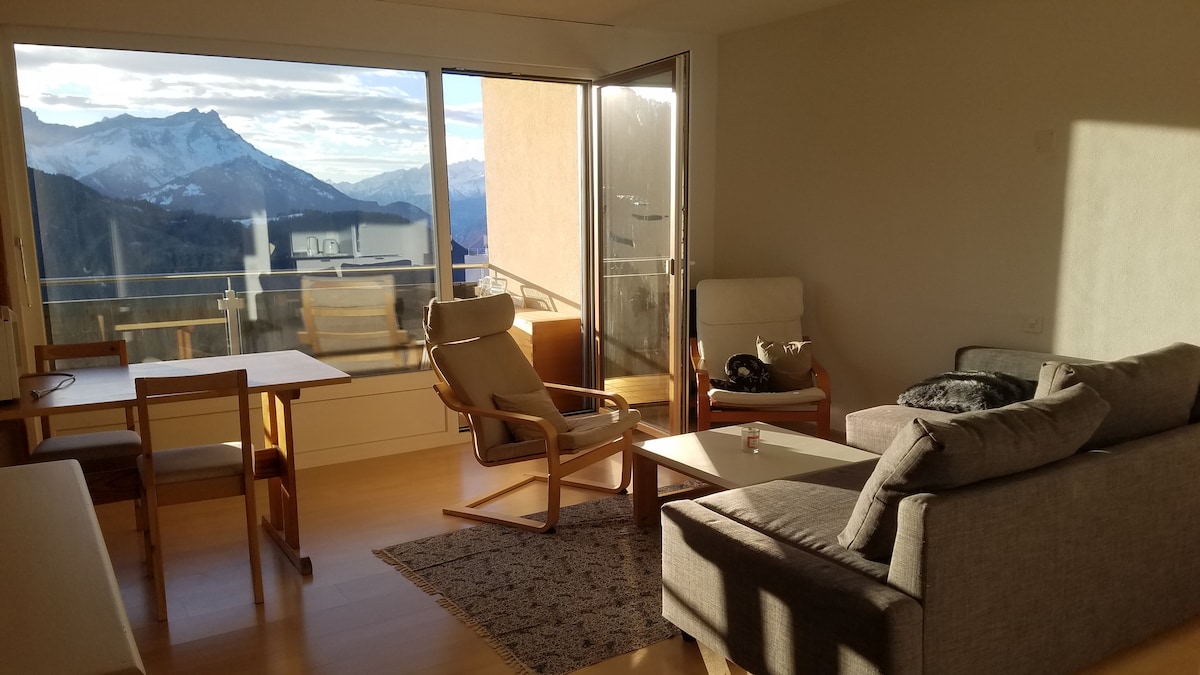 En Suisse, dans le petit village de Leysin, canton de Vaud, appartement-studio au rez-de-chaussée d'un chalet, 2 pièces 40m2 avec wifi, séjour-salon, salle de bain avec douche, coin canapé-lit, cuisine équipée avec induction et table-billard. Entrée indépendante, terrasse 15 m2 avec vue sur la plaine du Rhône et Dents du Midi, une place parking devant le chalet . Situé à 1300m d'altitude, à 300 mètres de la gare et du bus navette pour rejoindre pistes de ski et départ de randonnées.