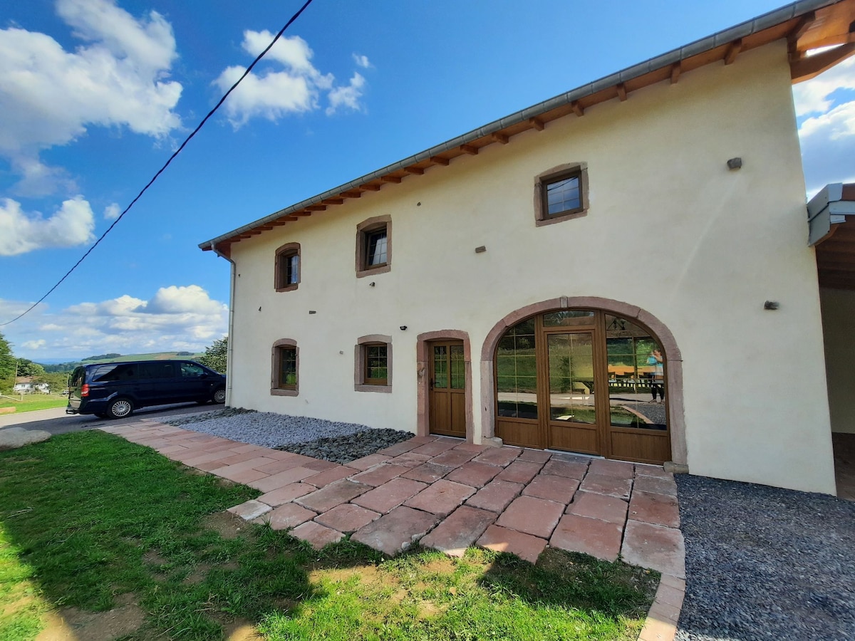 Ferme atypique rénové. Vous serez dans un cadre rurale au milieu de la nature. Vous bénéficiez d'un jardin aménagé et arboré . Vous êtes a quelques min de toutes commodités et à 20 min de Gérardmer pour les lacs et les pistes de skis. A 30 min de l'Alsace. Terrasse extérieure couverte, pièce type loft, bar et accès cave pour vos dégustation privé.. cabane, balançoire et tobagan J'ai hâte de vous faire profiter de ce lieu que j'ai entièrement rénové avec passion. Possibilité pour 4 sur demande.