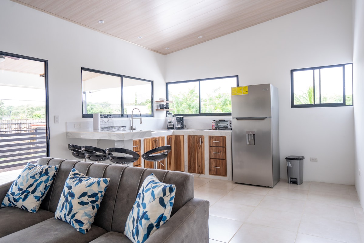 Casa del Bambu: A spacious retreat with a king bed in the bedroom, a twin bed in the living room (another second twin bed upon request), A/C, two smart TVs, high-speed Starlink WiFi, a large bath with a hot shower, and hot water at every faucet. Enjoy cooking in the fully equipped, screened-in semi-outdoor kitchen and unwind on the serene terrace amid lush landscaped gardens, just a 5-minute drive to Puerto Jiménez, close to beaches, restaurants, banks, and amenities.
