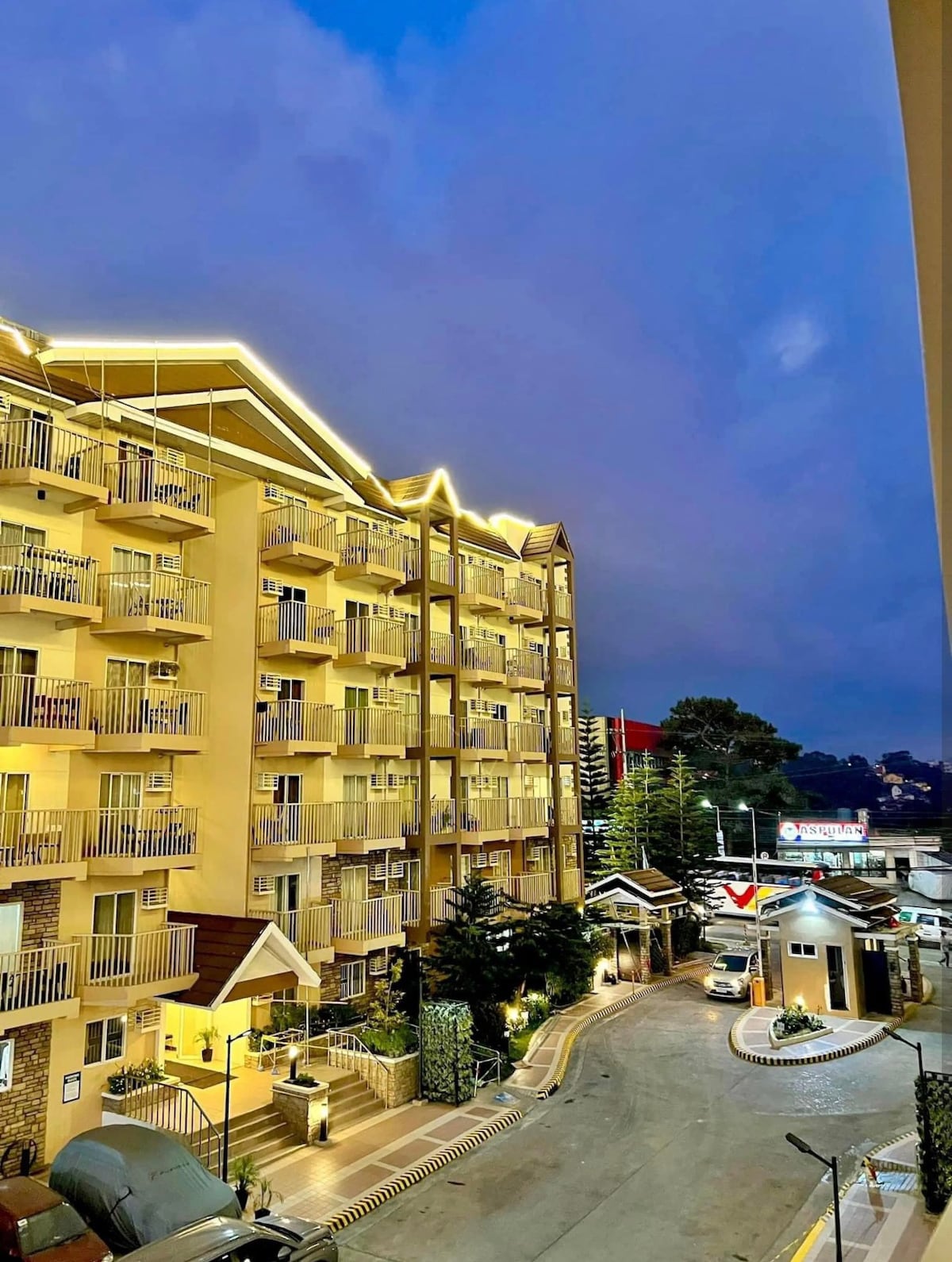 The unit is comfortable for 6, but can accommodate 8 - 2 on extra mattresses. There's a bar/ counter that doubles as the dining table. The place has a veranda which has a great view of Burnham park's Athletic Bowl. There's a parking slot for one car, the place has a guard too. Fiber wifi is newly installed at the unit. The building is beside the main road - so street noise can be heard in your unit. Near restaurants, the park, etc - you won't lack for anything interesting to do/ go to.