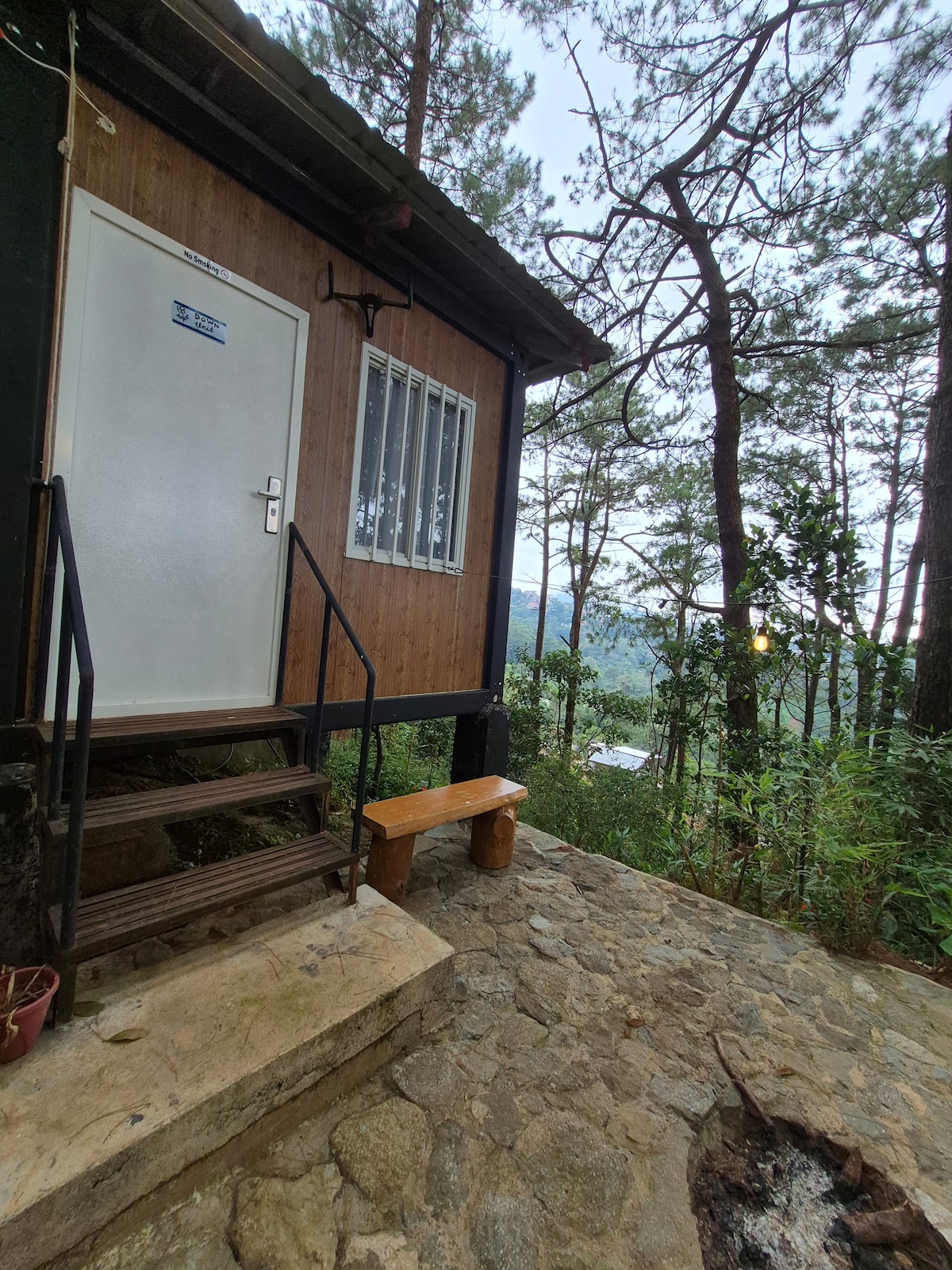 Amlangan Lodge room 3 is a private cozy room with 2 "double size" beds. It is located one floor level down the building entrance/lobby/dining with stairs to take. It has private toilet (with bidet) , sink, & bathroom (with hot shower) separate from each other, enabling guests to use these simultaneously and keeping the toilet floor clean, dry, and more comfortable. It has a balcony with a stunning view of pine forest & rock formations, which can also be viewed from your bed.