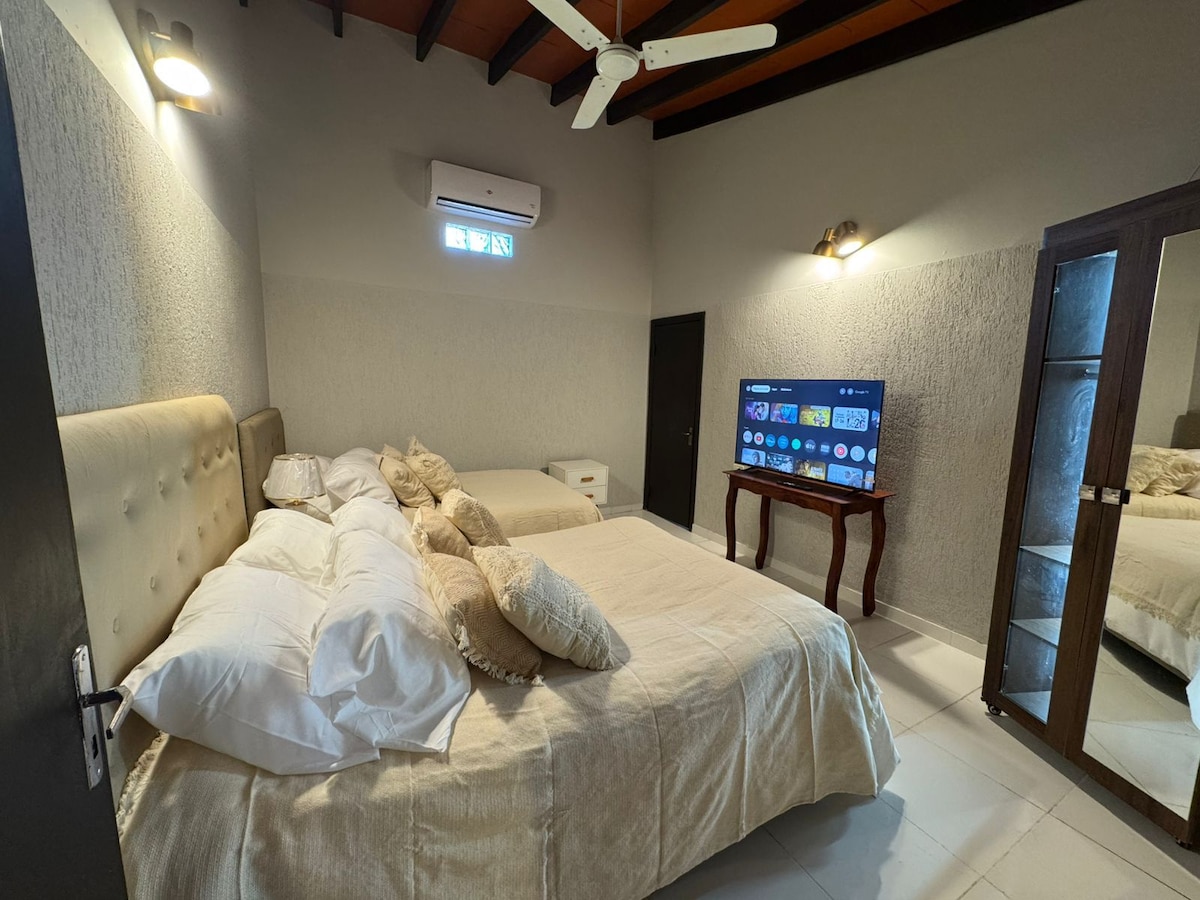 Disfruta de un alojamiento sencillo, tranquilo y con excelente ubicación céntrica. Desde el balcón podrás relajarte con una hermosa vista al bosque del centro, ideal para tomar un café o un tereré y compartir una buena charla. Un espacio cómodo y acogedor, perfecto para descansar y sentirte como en casa.