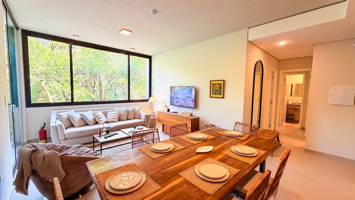 Disfruta de un departamento amplio, con todas las comodidades y relájate en esta escapada única y tranquila. Un patio privado que hace la diferencia, y conecta aún más con la naturaleza que te rodea.. Además de todos los Amenities que el condominio ofrece, sendero para caminatas, gimnasio, pileta, canchas de fútbol, pádel y tenis.
