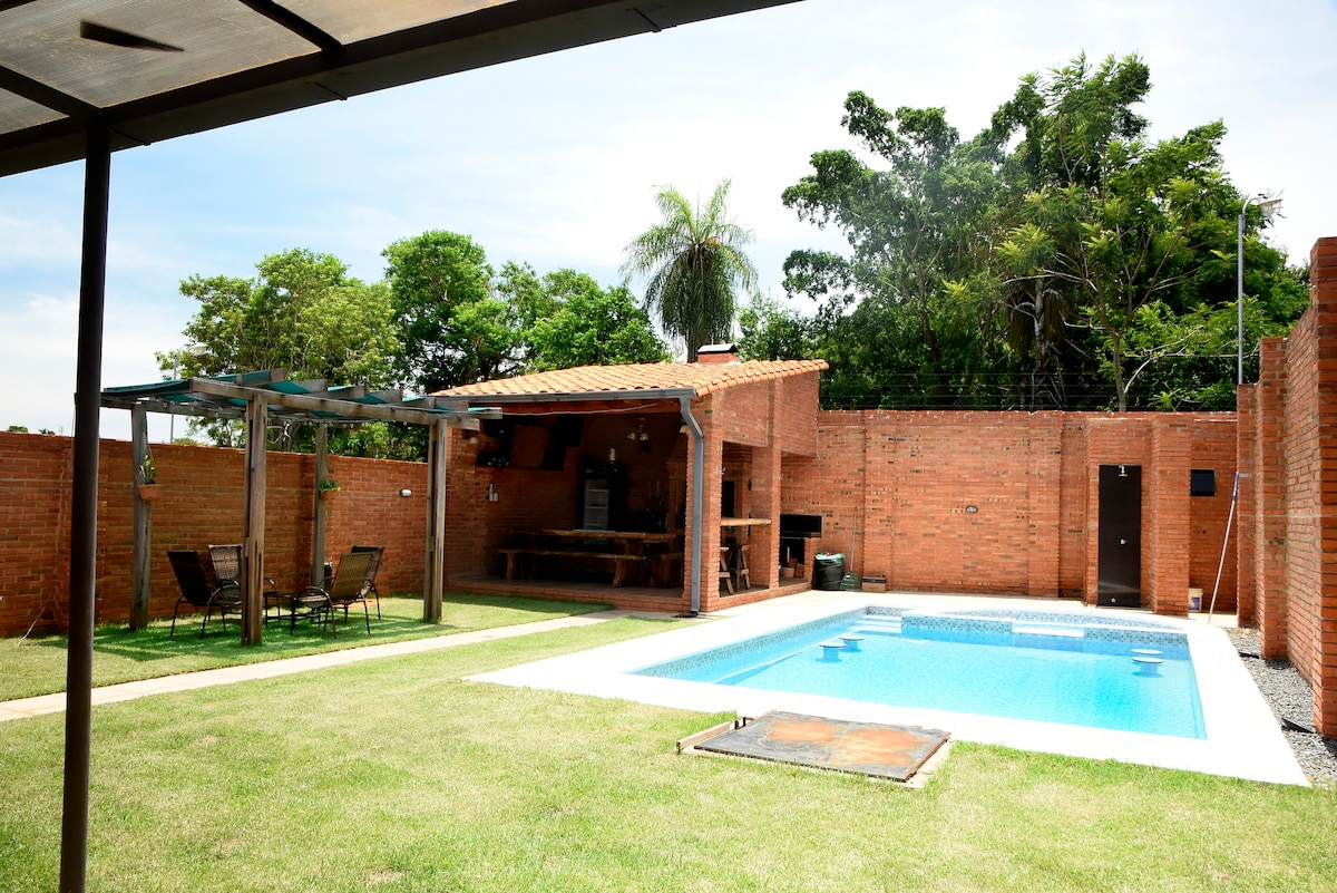 Enjoy your perfect summer getaway at Don Vera. This spacious home accommodates up to 12 guests and features a private 8×4 m pool with jacuzzi, BBQ area with grill, and a large garden. It offers 3 air-conditioned bedrooms, 2 full bathrooms plus a guest restroom, and an open-plan living area with a fully equipped kitchen, dining space, and 55″ TV. Wi-Fi included. Ideal for relaxing, sharing moments, and enjoying Paraguay’s great weather in a safe and comfortable setting.