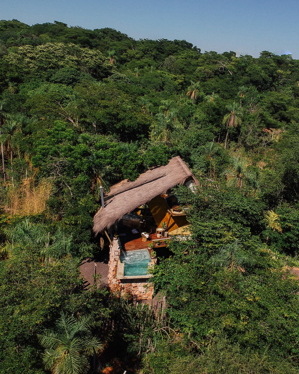 Bungalow Apolo Es un Bungalow Satori Premium, situado en un área de bosque natural de acceso restringido, en la cima del cerro. Tiene dos plantas, construidas en la altura de la copa de los árboles, en medio de un exuberante bosque tropical privado. Su estructura es de madera, vidrio, piedras y techo de paja. Tiene un diseño de vanguardia, moderno y a la vez cálido, en forma de rectángulo inclinado.