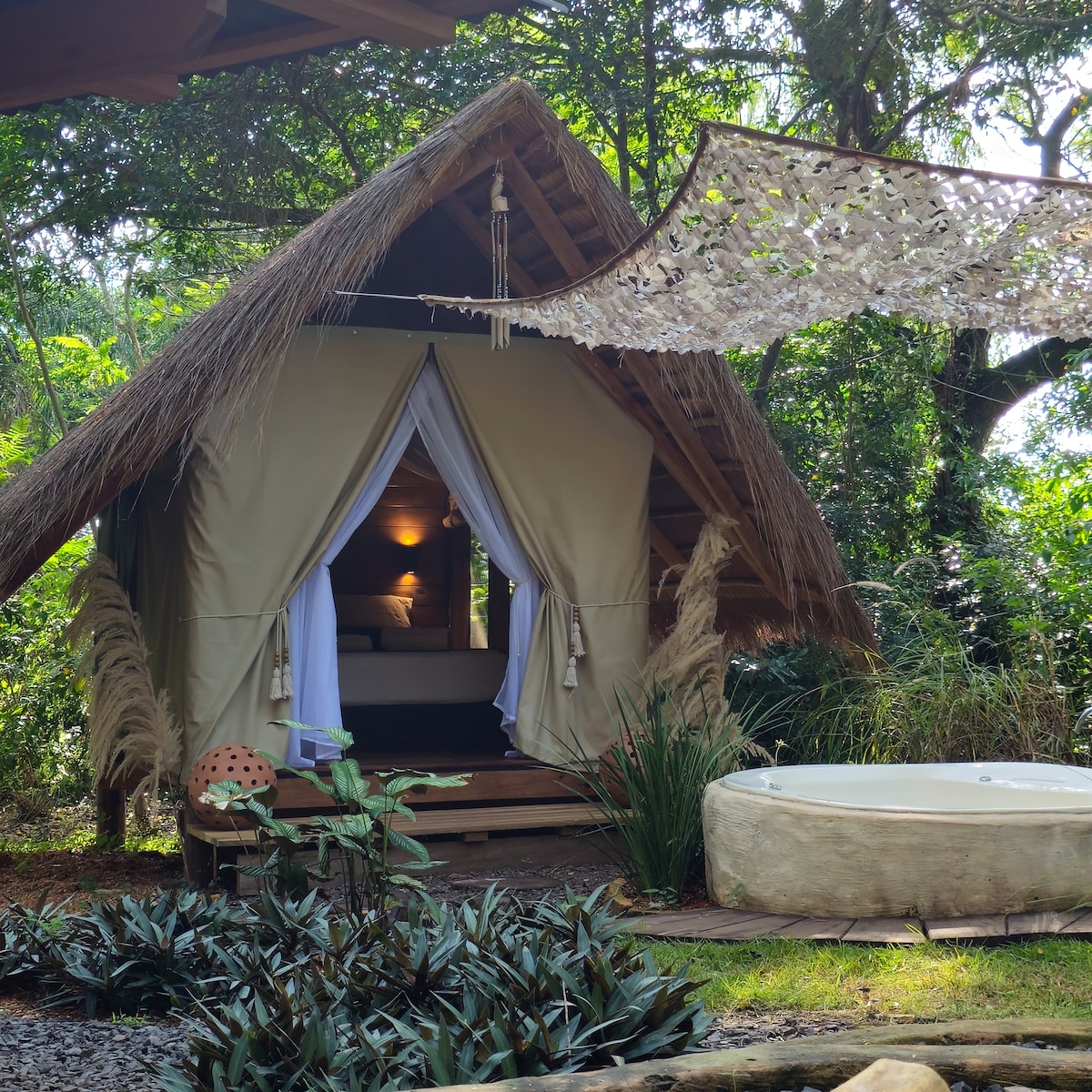 El espacio Nomade Glamping clair de Lune dispone de una burbuja de naturaleza de 200m2 de privacidad al dentro de un predio de 2 hectáreas. La habitación es una cabaña estilo glamping de dos pisos en los arboles. La habitación dispone de una cama kingsize, ventanas largas y un ventilador. El espacio propone tambien una pequeña piscina privada, un baño privado, un cocina y espacio lounge y fogata tradicional. Tienen acceso a una piscina mas grande en el predio compartido con los otros 3 glampings