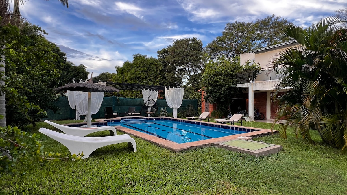 Enjoy your perfect summer getaway at Don Vera. This spacious home accommodates up to 12 guests and features a private 8×4 m pool with jacuzzi, BBQ area with grill, and a large garden. It offers 3 air-conditioned bedrooms, 2 full bathrooms plus a guest restroom, and an open-plan living area with a fully equipped kitchen, dining space, and 55″ TV. Wi-Fi included. Ideal for relaxing, sharing moments, and enjoying Paraguay’s great weather in a safe and comfortable setting.