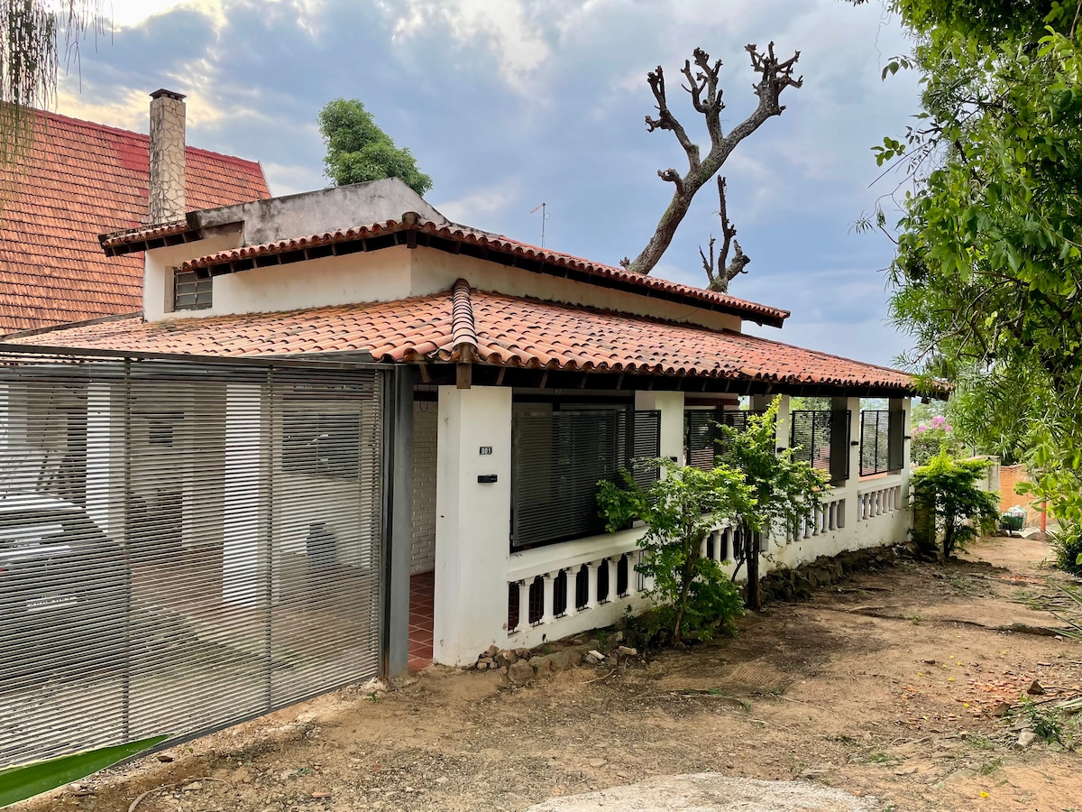Cómoda casa construida en medio de un pequeño bosque preservado. El espacio ofrecido en este anuncio forma parte de una gran construcción dividida en dos sectores: 1 La casa en la que vivo 2 espacio de invitados separado. compartidos conmigo: el área al aire libre y la piscina. Ubicado en la ciudad de Areguá, a orillas del lago Ypakarai, que es conocida por sus artesanos de arcilla y plantaciones de frutillas que atraen visitantes durante todo el año. La casa dispone de sistema de alarma y wifi.