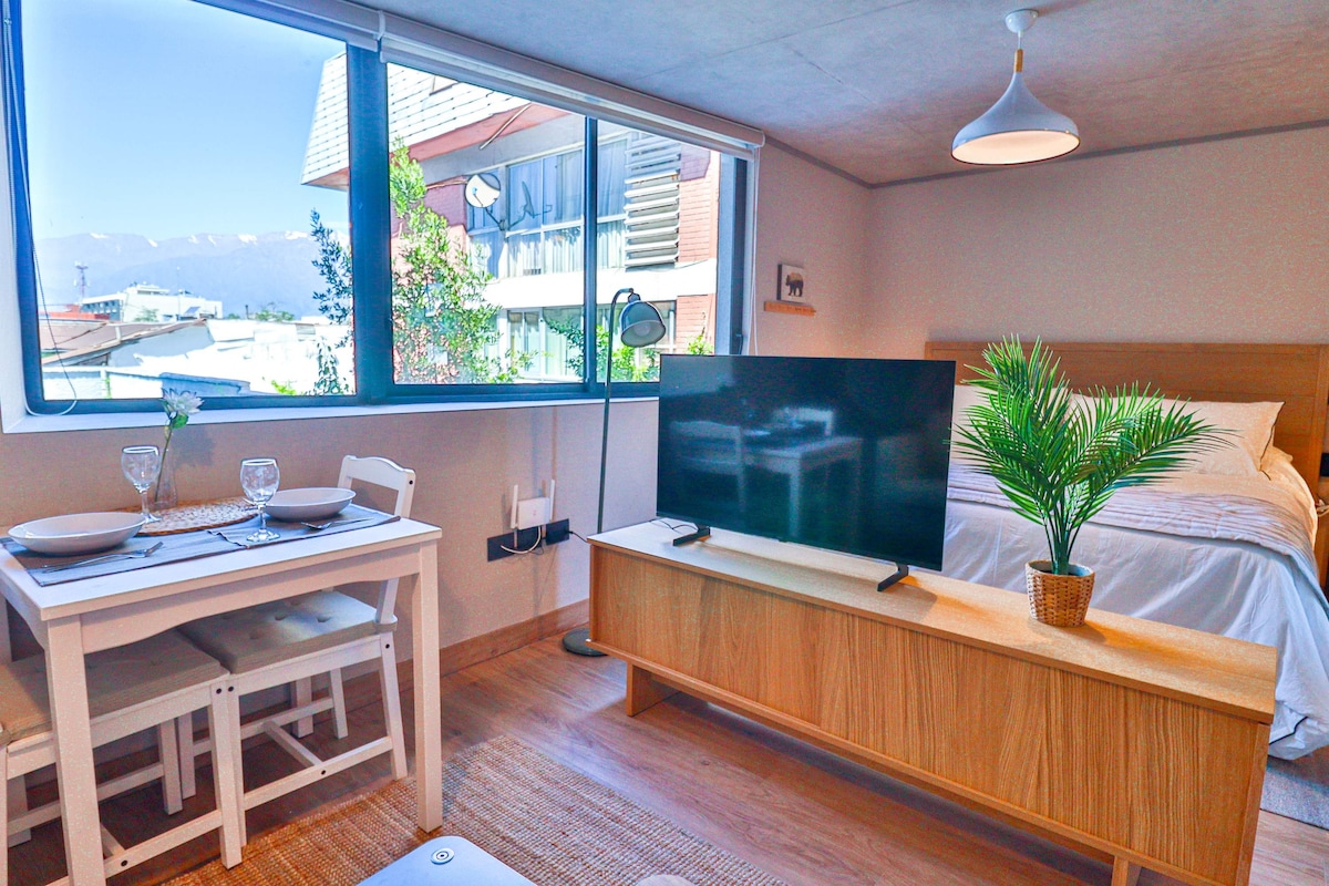 Modern, well-kept studio in Santiago, in a quiet area of La Florida, just 2 min 🚇 from Bellavista La Florida Metro and Mall Vespucio. Everything within walking distance: supermarkets, clinics, pharmacies, restaurants, and essential services. Ideal for couples, tourists, or work trips. Includes AC ❄️, high-speed WiFi 📶, equipped kitchen, 55” smart TV, modern bathroom with bidet + drying 🚿, work/dining table 💻, terrace with city + mountain views 🌃, and easy self check-in.