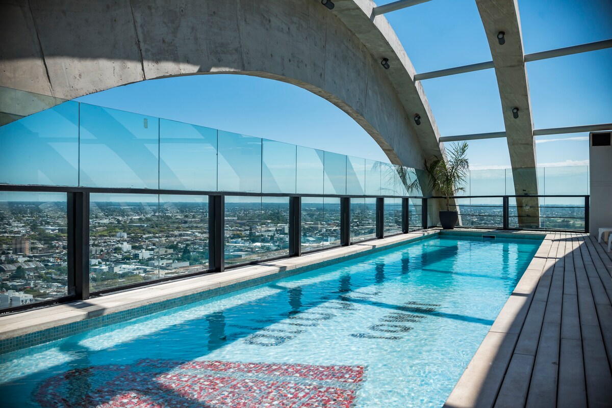 Viví Córdoba desde la torre más alta de la ciudad, con espectaculares vistas 360 desde el piso 35. Departamento moderno y luminoso, ideal para trabajo remoto o escapadas. Disfrutá piscina en altura con solárium, gimnasio, espectacular co-living, soñados quinchos con asador y laundry. Podés elegir desayunar o merendar en la cafetería del piso 33, o cocinar un rico asado en cualquier momento. A minutos del centro y rodeado de los mejores bares y restaurantes de la zona.