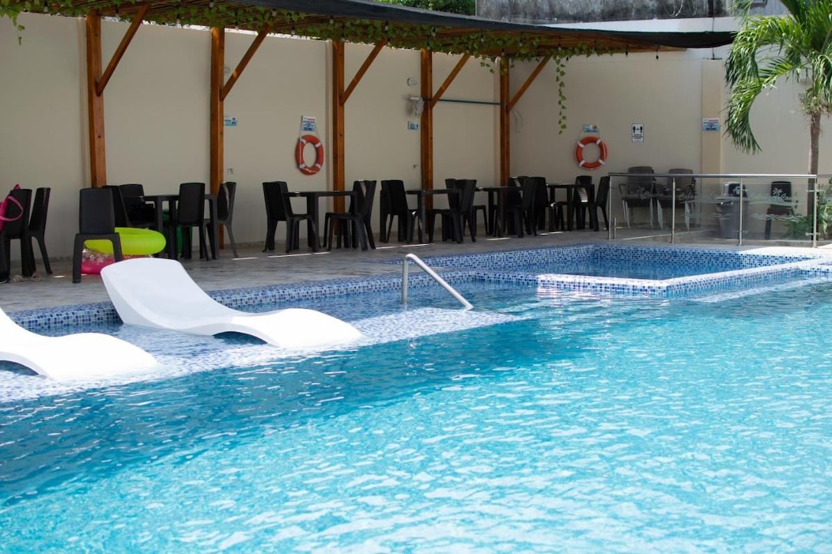 PARA ESTADIAS DE 1 A 2 PERSONAS PUEDE CONSULTAR LA OFERTA ESPECIAL . Es un lugar muy tranquilo, primer piso, cocina completamente dotada incluyendo lavadora y zona trasera para tender colgar ropa, dispensador de agua de bebida, etc. Tiene piscina para niños, piscina para adultos, terraza de billares y zona para asados y parqueadero gratuito. NOTA: La reposición de agua de bebida se realiza por parte del huésped