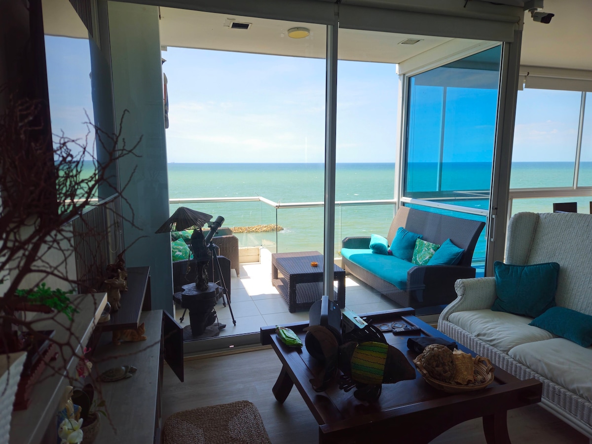 Espectacular apartamento que brinda una experiencia única frente al mar, Es un piso 7 con balcón y vista directa al océano. Tiene capacidad para hasta 10 personas, 3 habitaciones con baño privado, aire acondicionado y balcón. Cuenta con wifi, cocina totalmente equipada, sala comedor, zona de ropas con lavadora y 2 parqueaderos privados. El edificio ofrece ascensor, piscina para adultos y niños y terraza con Jacuzzi. Ideal para descansar y disfrutar en familia.