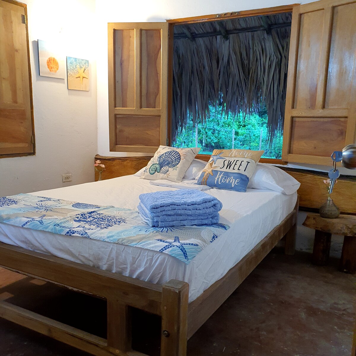 La habitación Pulpo tiene 1 cama doble queen, para albergar hasta 2 personas. La Coralina azul, es un hotel ubicado en un ambiente natural a 5 minutos caminado del mar, cuenta con 2 cocinas compartidas, 2 zonas de comedor, zonas interior y exterior de hamacas. Para los niños hay una zona con arenero y columpios. Es un sitio maravilloso. El mar y la naturaleza te invitan a ser feliz allí los pajaros y los monos te saludan en la madrugada. Relájate en esta escapada única y tranquila.