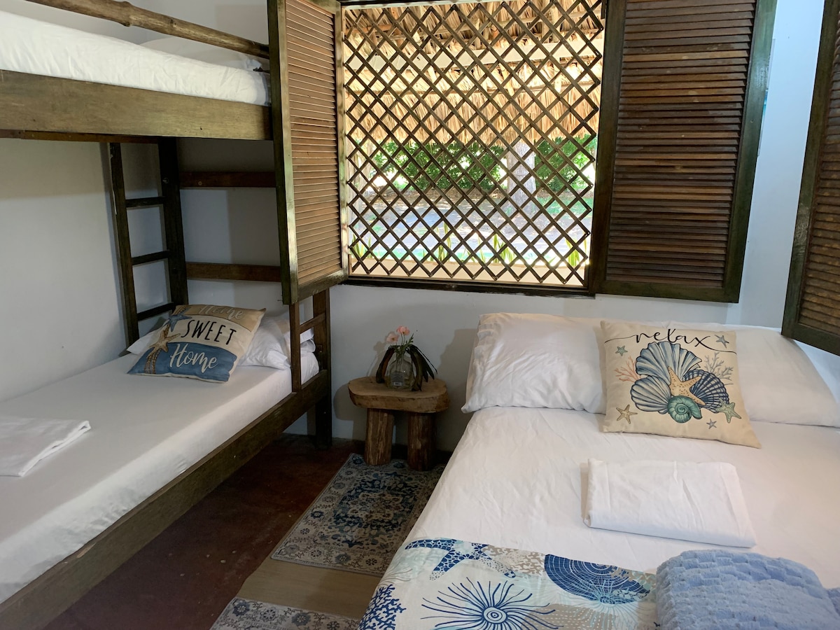 La habitación Ballena tiene 1 cama litera, 1 cama doble y baño privado, con capacidad para albergar hasta 4 personas. La Coralina azul, es un eco hotel ubicado en un ambiente natural a 5 minutos caminado del mar, cuenta con 2 cocinas compartidas, 2 zonas de comedor, zonas interior y exterior de hamacas. Para los niños hay una zona con arenero y columpios. Es un sitio maravilloso donde los pajaros y monos aulladores te saludan en la madrugada. El mar y los arboles te invitan a ser feliz.