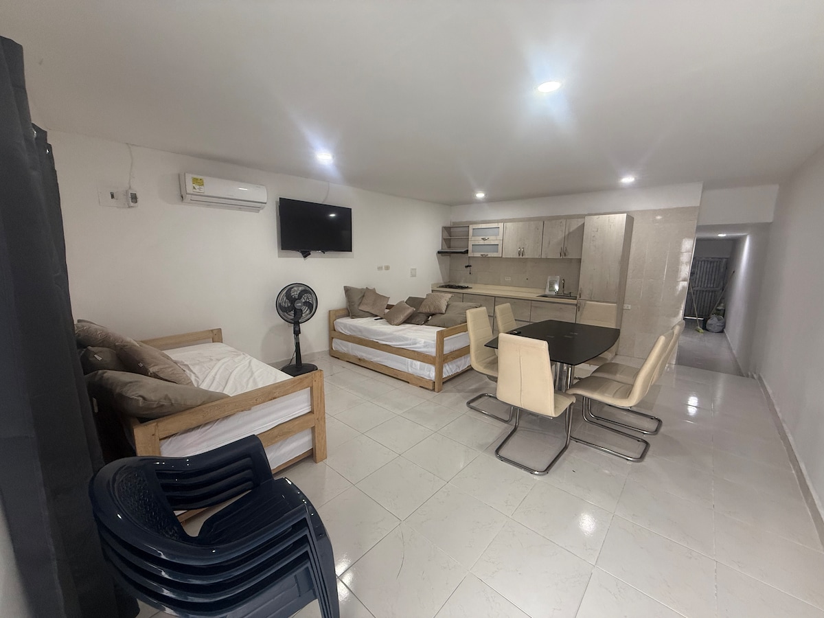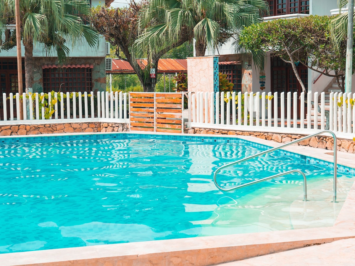 Es un lugar muy tranquilo, primer piso, dotado con nevera, microondas, lavadora, aires acondicionados por alcoba, y sofá-cama en alcoba principal si va con niños, además ventiladores en la sala - comedor, dos televisores, equipo de sonido, dispensador de agua de bebida, poceta trasera para lavar a mano y colgar ropa. Tiene piscina para niños, piscina para adultos, terraza de billares y zona para asados. NOTA: La reposición de agua de bebida se realiza por parte del huésped