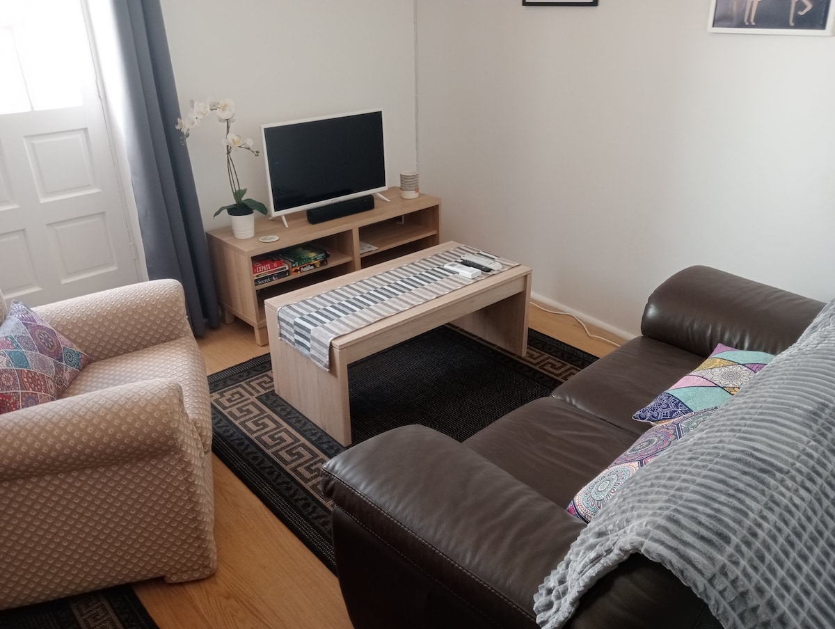 Stunning and comfortable 2 bedrooms flat with a view to a nice park and green areas. This brand new apartment comprises a modern living-room, one bedroom with a double bed size and second bedroom with 2 individual beds. We can accommodate up to 5 people as we also provide a bed in the living room. In addition, 2 bathrooms and a fully equipped kitchen at your disposal. Love at first sight guaranteed!!! Amenities included (soap, gel, shampoo, bath towels)