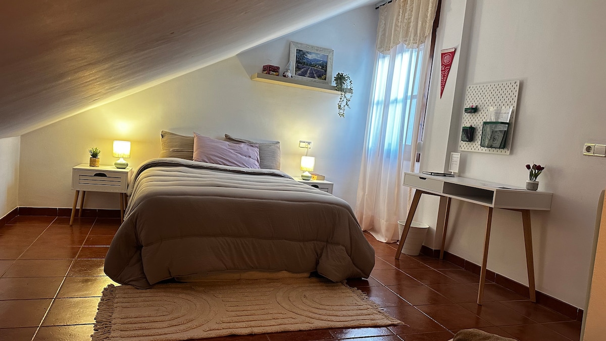 Es una habitación abuhardillada. Consta de una cama, escritorio, y armario. La casa está situada en el centro histórico de Córdoba, cerca de monumentos. En los alrededores hay supermercados, líneas de autobús, y otros servicios. La habitación está en una segunda planta. Acceso por escaleras .