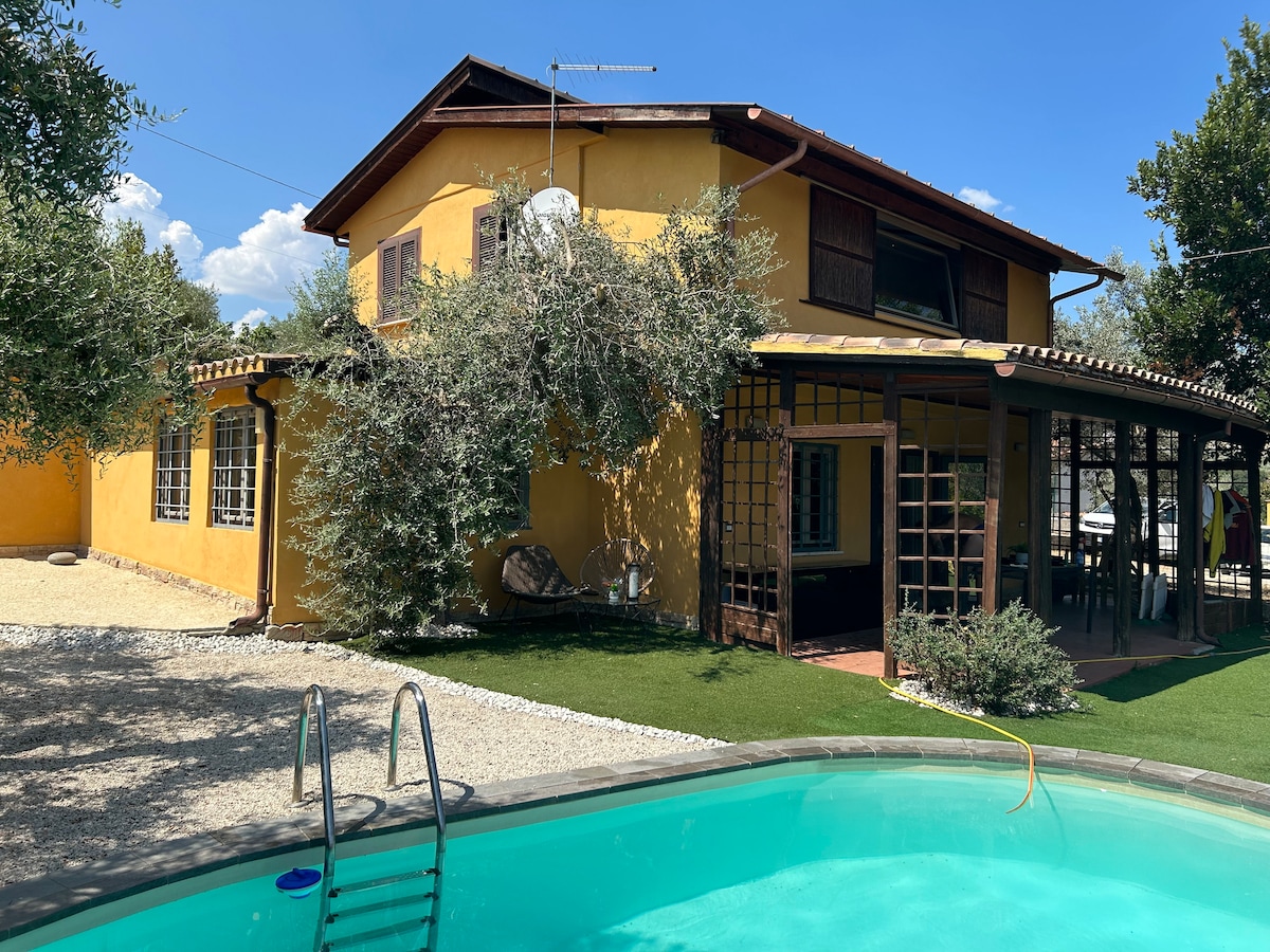 Immersa nel cuore della Sabina, all'interno di un uliveto, questa villa offre fino a 10 posti letto, 3 ampie camere matrimoniali con aria condizionata, 2 bagni, cucina attrezzata e soggiorno accogliente con camino e divano letto. All’esterno, ampio spazio verde ideale per rilassarsi con parcheggio privato. Wi-fi gratuito. Perfetta per famiglie o gruppi che cercano tranquillità e autenticità a due passi dalla natura. A richiesta utilizzo di ampio spazio per feste/cene dotato di camino e bagno