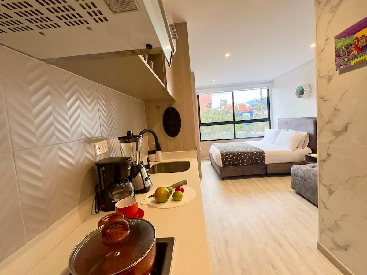 Modern studio apartment in Teusaquillo, steps from Corferias. Approx. 6 minutes by car from the U.S. Embassy, close to the National University and 10 minutes from El Campín Stadium (travel times may vary depending on city traffic). Ideal for work, or tourism. Queen bed, sofa bed, Smart TV, fast Wi-Fi, equipped kitchen, and private bathroom. Building with coworking, gym, yoga room, games, 24/7 security, and self check-in. No private parking (nearby options available).