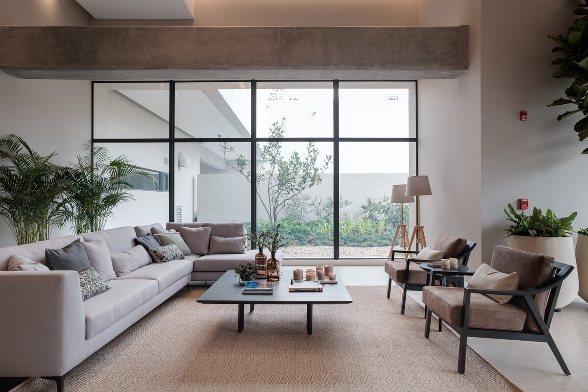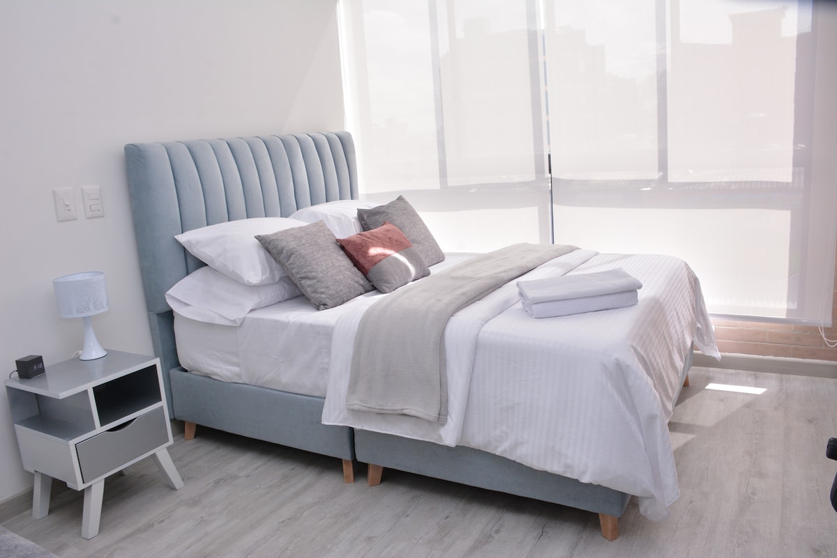 Stunning loft with breathtaking city & mountain views. Indulge in the most luxurious bed in the building, providing a level of comfort akin to a five-star hotel. Plush pillows ensuring the best sleep of your life. Enjoy a 60" TV with Netflix, a well-equipped kitchen, and relax in the easy chair by the window. Hot water shower, Hairdryer, ample closet space, and a perfect work area. Upcoming amenities: rooftop, coworking, gym. Close to Transmilenio station. Book now for an unforgettable stay