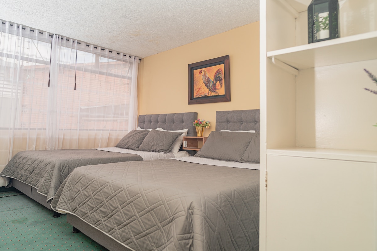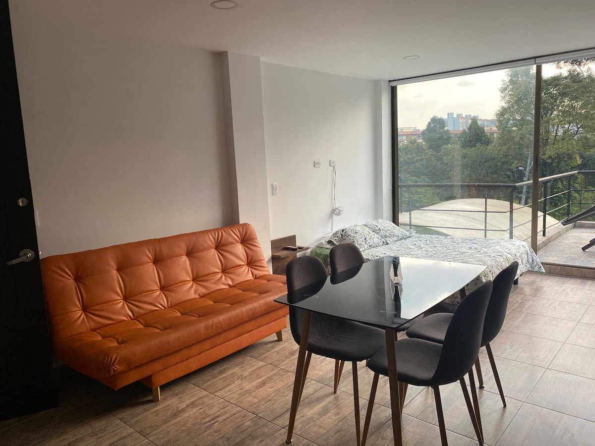 Our comfortable one bedroom apart-studio, interior location with windows towards a garage, and to a courtyard, bohemian, minimalist, with a small garden has a true city feeling! It comfortably accommodates four people and it´s centrally located on a street, with easy access to Simon Bolivar Metropolitan Park. Enjoy a complete kitchen, and access to Transmilenio. This space is ideal for two people; however, we provide a high quality sofa bed for two more people should the need arise. Hot water