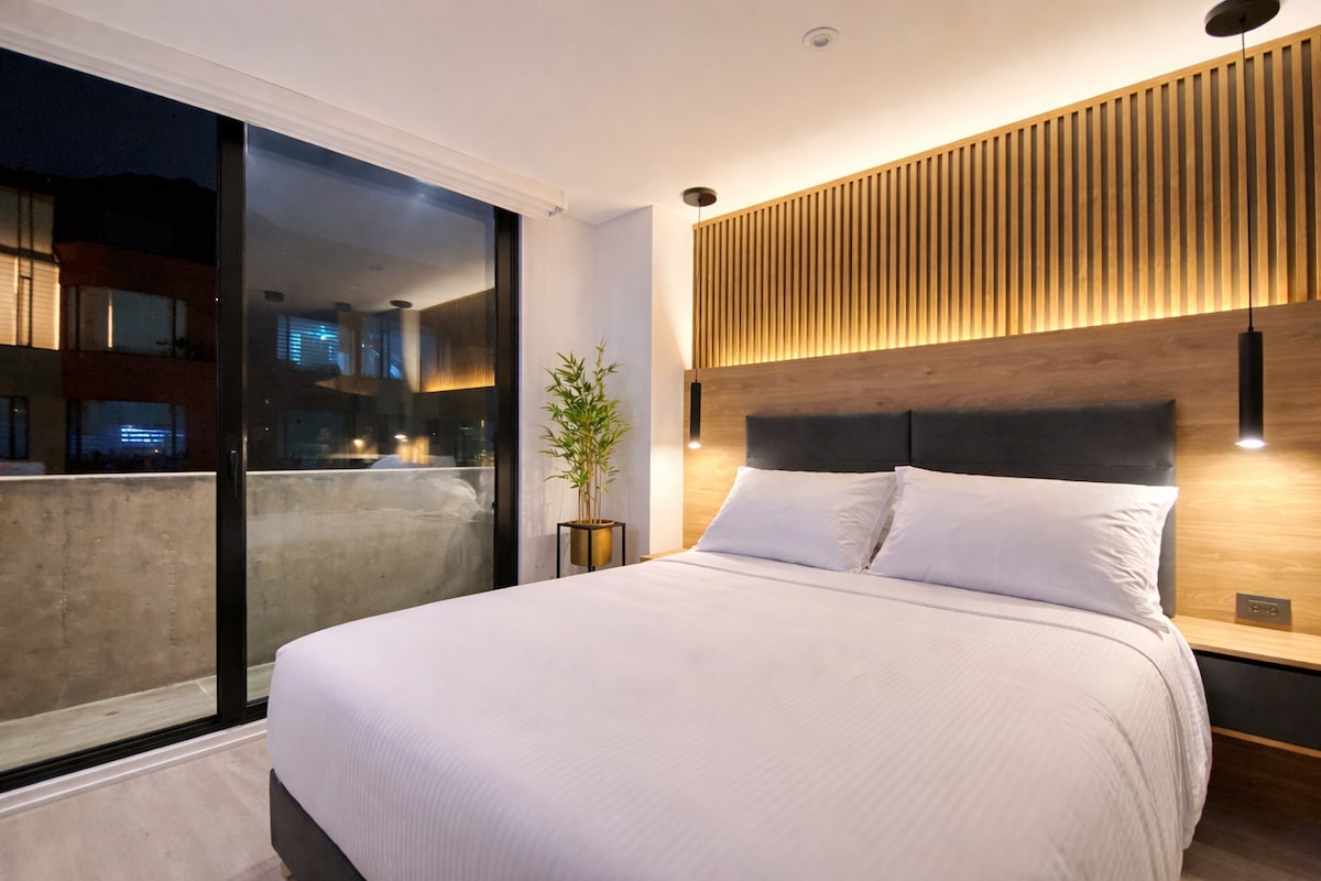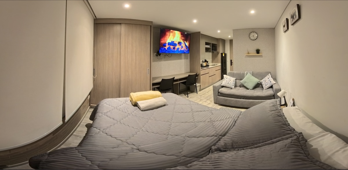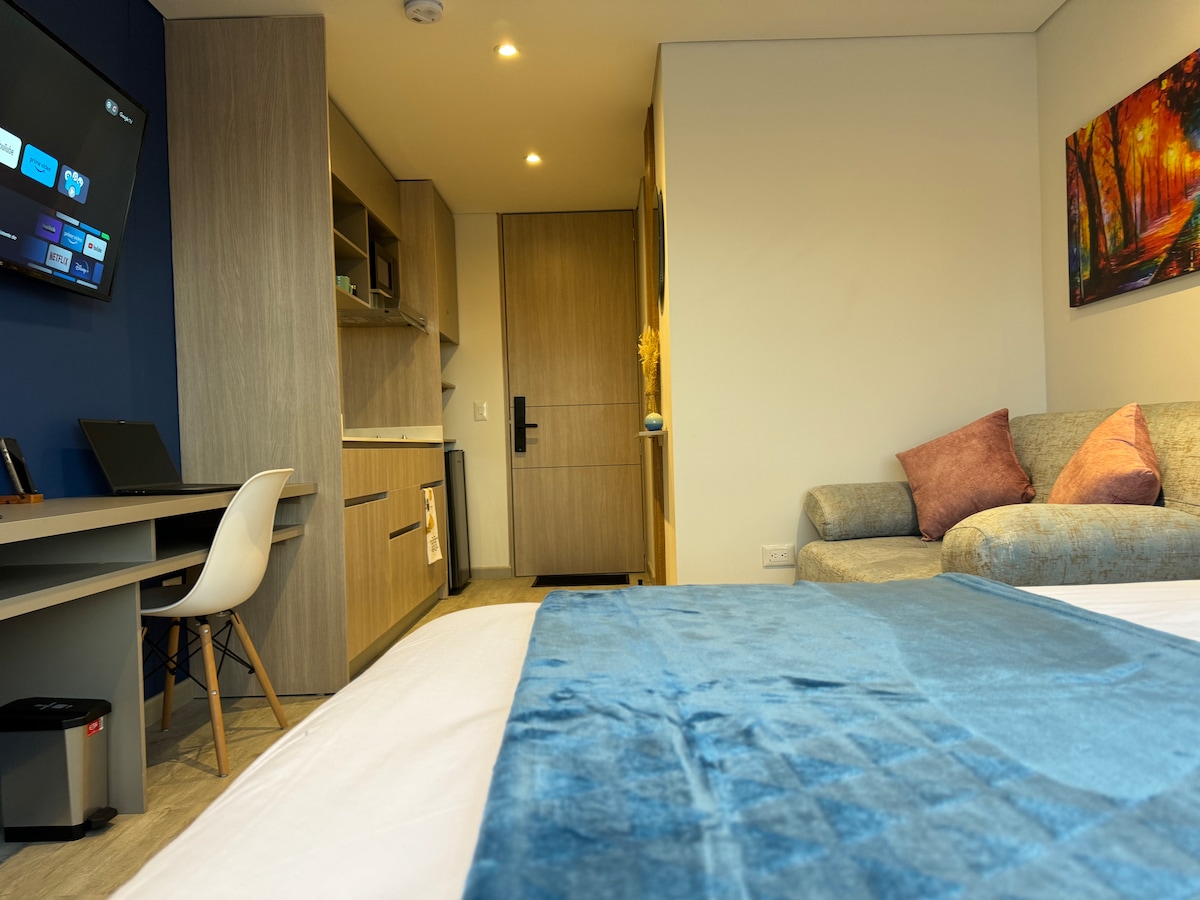 Hermoso apartaestudio con un espacio abierto y luminoso con vista exterior y excelente diseño. Una cama extradoble comoda, un sofacama y una cuna. Cocina full equipada. Conexión wifi de alta velocidad (500M). Ubicado en una zona tranquila y segura cerca de Corferias, embajada americana, Movistar, aeropuerto y transporte público. El edificio tiene lavanderia y una amplia zona de coworking y salas de reuniones. Ideal para parejas o familias pequeñas que buscan comodidad y estilo.
