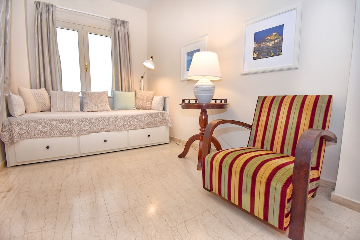 My home(69m2) is a two level apartment in the heart of the Old Town of Corfu, about 300m from Liston and Spianada. It is a perfect basis for exploring the town and the island, situated in a neighborhood called Evraiki. Almost everything you will need like super market, restaurants, bakeries, pharmacy e.t.c. is within a walking distance.A free municipal parking, a taxi station and bus stop are very close (60-100 m). The guest bed downstairs is convertible into a comfortable double bed(1.60*2.00)